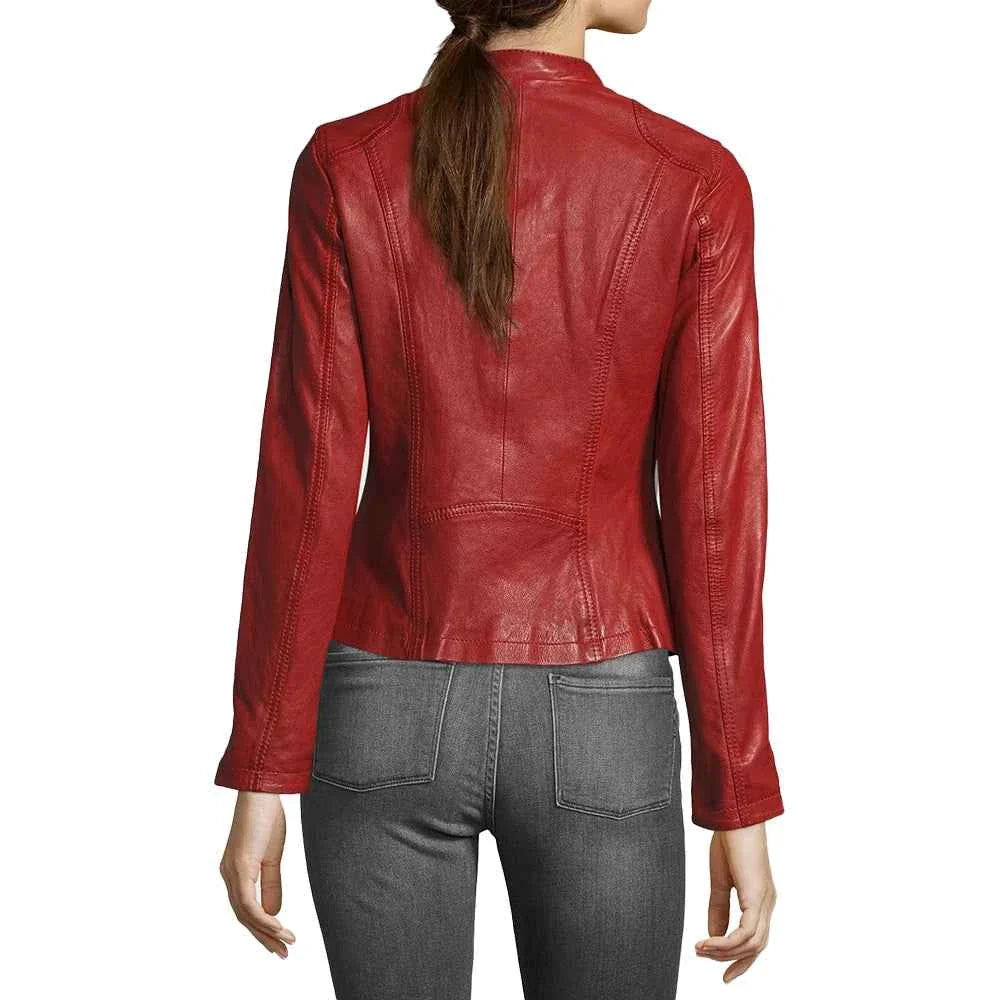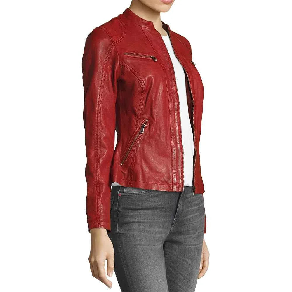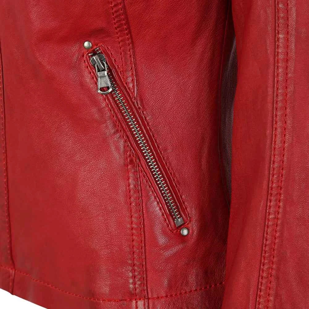 Are you looking to make a statement and stand out in the crowd? Wear the exotic Red Leather Biker Jacket womens today! Featuring a perfect biker design made from premium leather with butter soft touch, this red leather jacket gives the perfect blend of attitude and style. Take the front zipper closure and the stand-up collar and pair it with the relaxed bodice that features zippered pockets, because it’s both very comfortable and practical. Celebrity-inspired touches of straight cuffs and biker design introduce a playful and rebellious note. The sleek womens red leather jacket can be considered the epitome of fashionable confidence for anyone looking for a staple piece in their wardrobe.