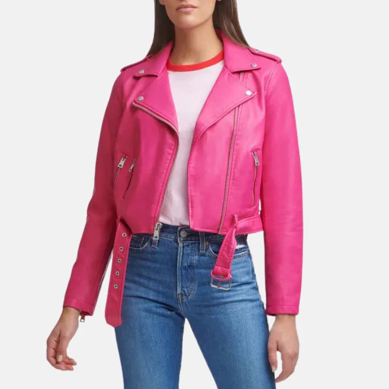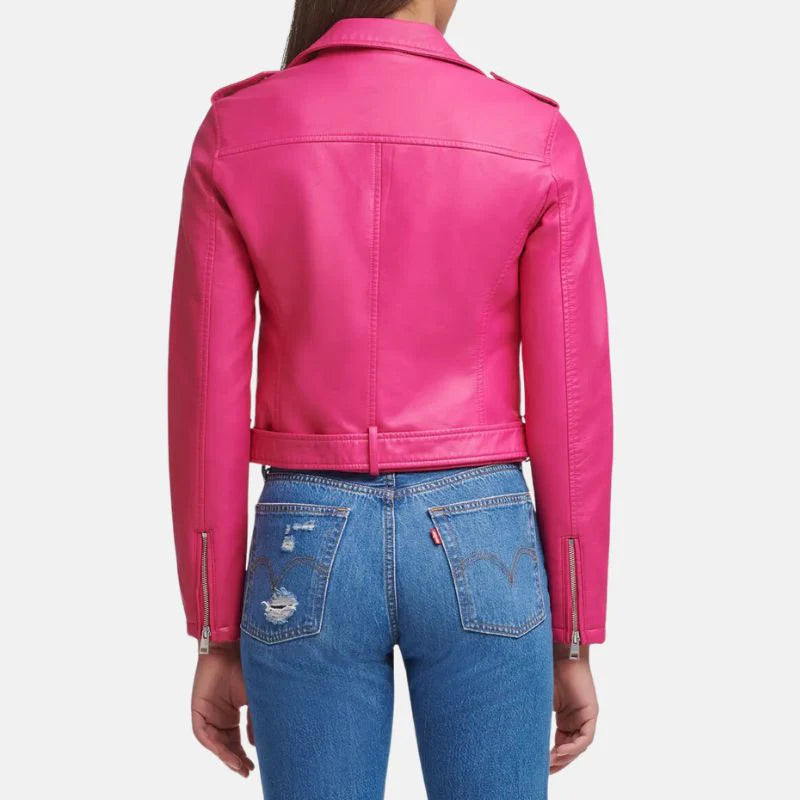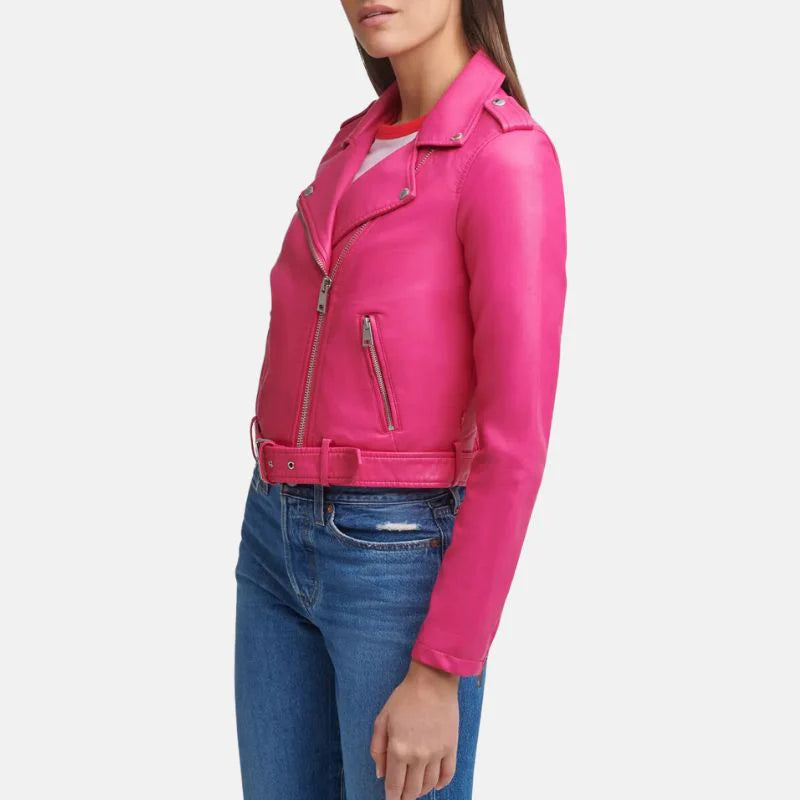 This asymmetrical leather hot pink jacket womens is a real eye catcher! It's made from super soft, premium leather and the inside is lined with a smooth viscose material for extra warmth. It's designed with an asymmetrical cut, meaning the hemline falls unevenly for a trendy look. The sleeves have zipped cuffs to keep the wind out, and there are even straps on the shoulders for a bit of an edgy vibe. Whether you zip it up all the way or leave it open, the front zipper closure makes it easy to put on and take off. To top it all off, this hot pink leather jacket comes with an adjustable belt to cinch your waist for a flattering silhouette.