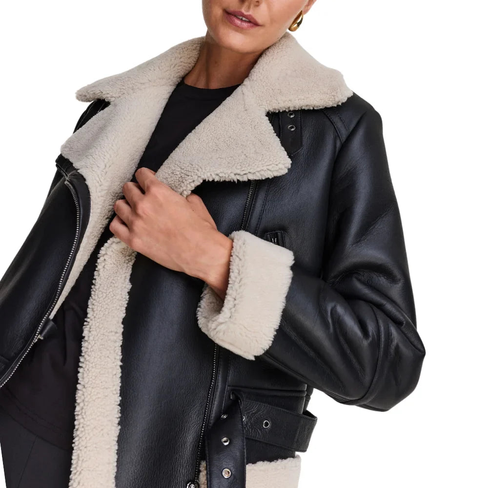 If you're planning to travel in style, you can't miss this stunning B3 Black Bomber Leather Aviator Jacket Women's. It's made of premium sheepskin leather on the outside and cozy shearling on the inside. The black base with white sherpa collars and edges, along with the fur finish, adds a touch of elegance. This black shearling leather jacket Features an asymmetrical zipper closure and front pockets with flap & button closure. The design is simple yet incredibly appealing. Plus, it's available in various sizes to suit your preference.