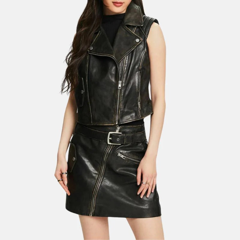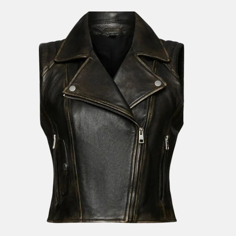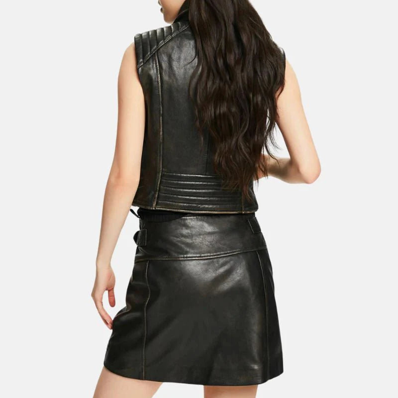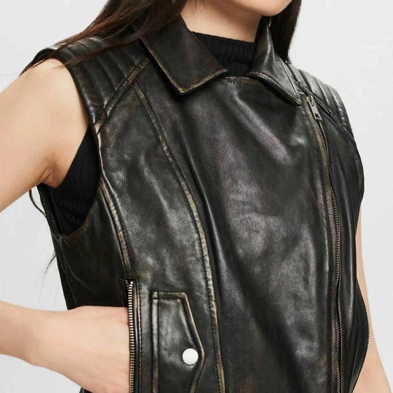 Black Distressed Leather Biker Vest Womens