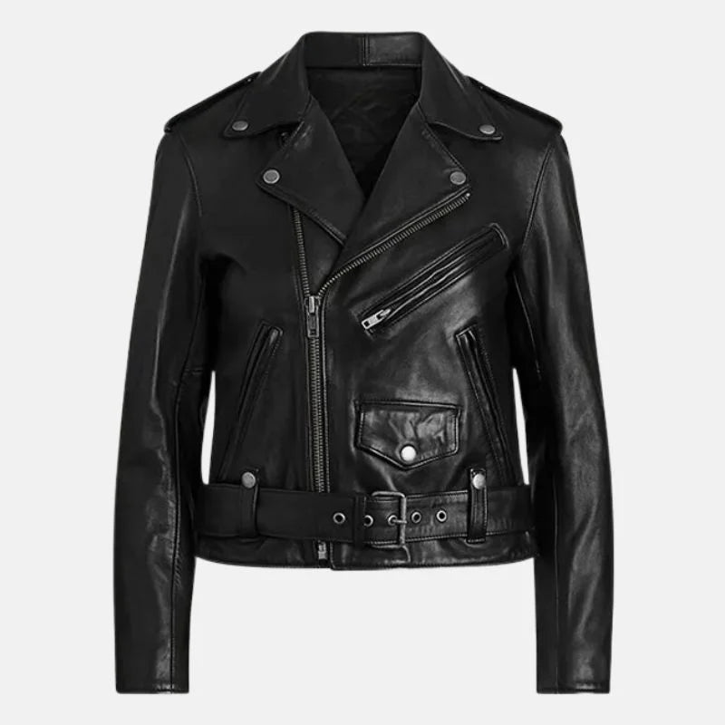 Embrace the bold spirit of the open road with our Black Leather Motorcycle Jacket for women. Crafted from premium sheepskin leather, it offers both style & durability. The turned down collar adds a touch of elegance, complementing the sleek black color. The soft viscose inner ensures comfort on every journey. With a front zipper closure & multiple pockets, this jacket effortlessly combines fashion & function. Ride in style & make a statement with this timeless piece that echoes both strength & sophistication.