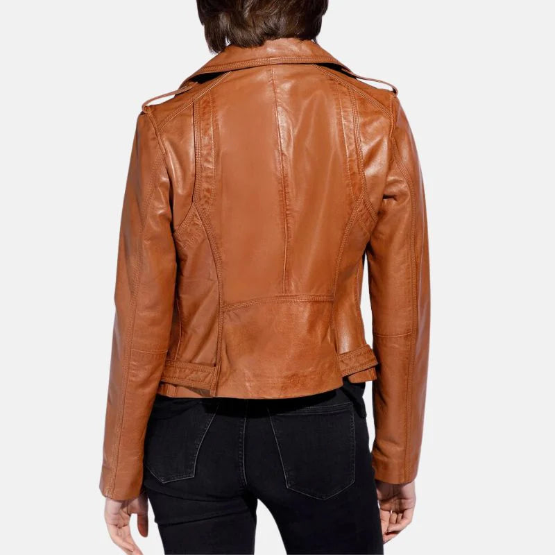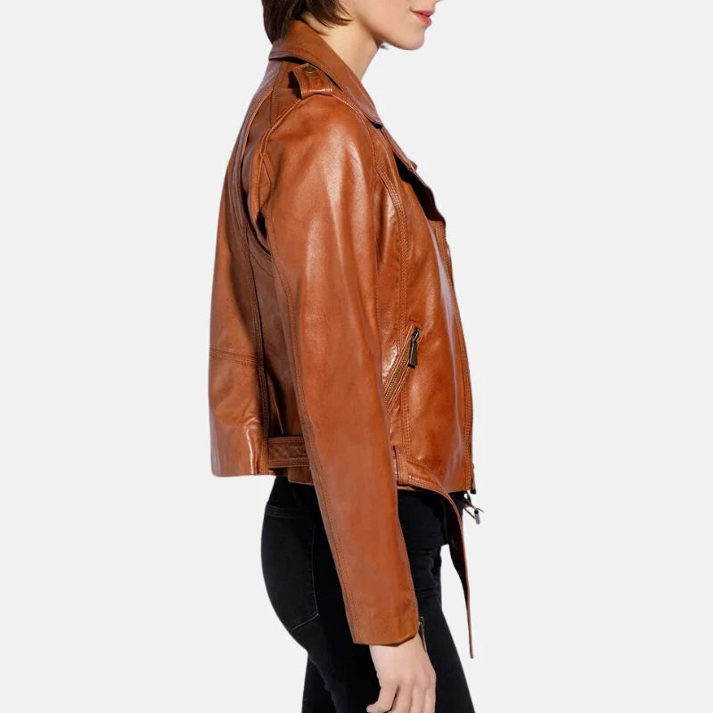 Looking for a jacket that's both stylish and tough? This brown leather motorcycle jacket womens is the perfect pick. It's made from 100% premium leather which is soft yet durable and keeps you comfortable on the go. The moto style gives it an edgy look with an asymmetrical zipper closure that adds a touch of coolness. It also features zipper cuffs to keep out the wind and multiple pockets to store your essentials. Adjustable straps on the shoulders and a waist belt allow for a customized fit. Whether any woman riding a motorcycle or just rocking a biker chick vibe, this womens brown jacket will turn heads.