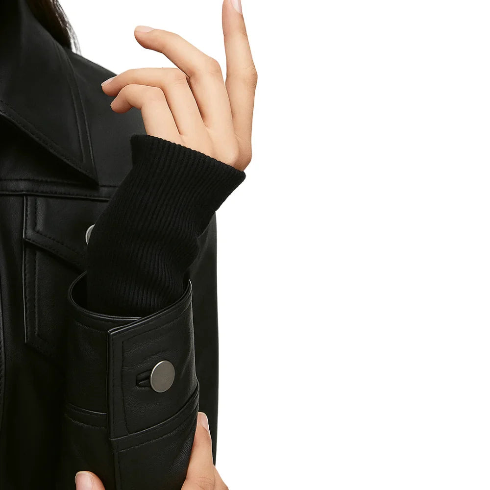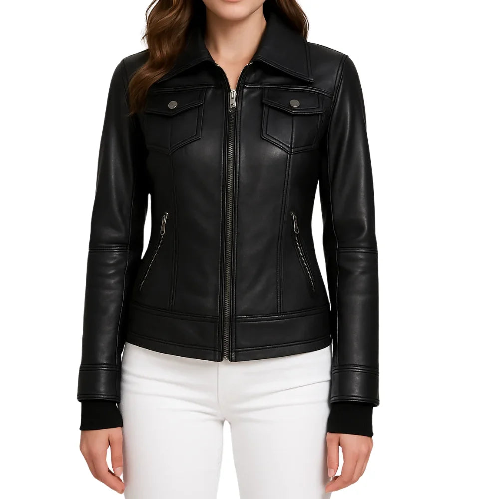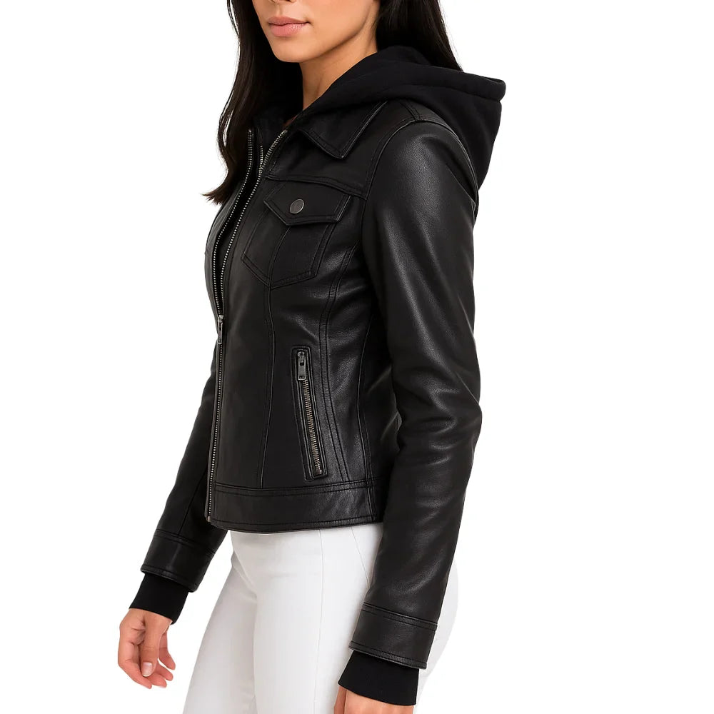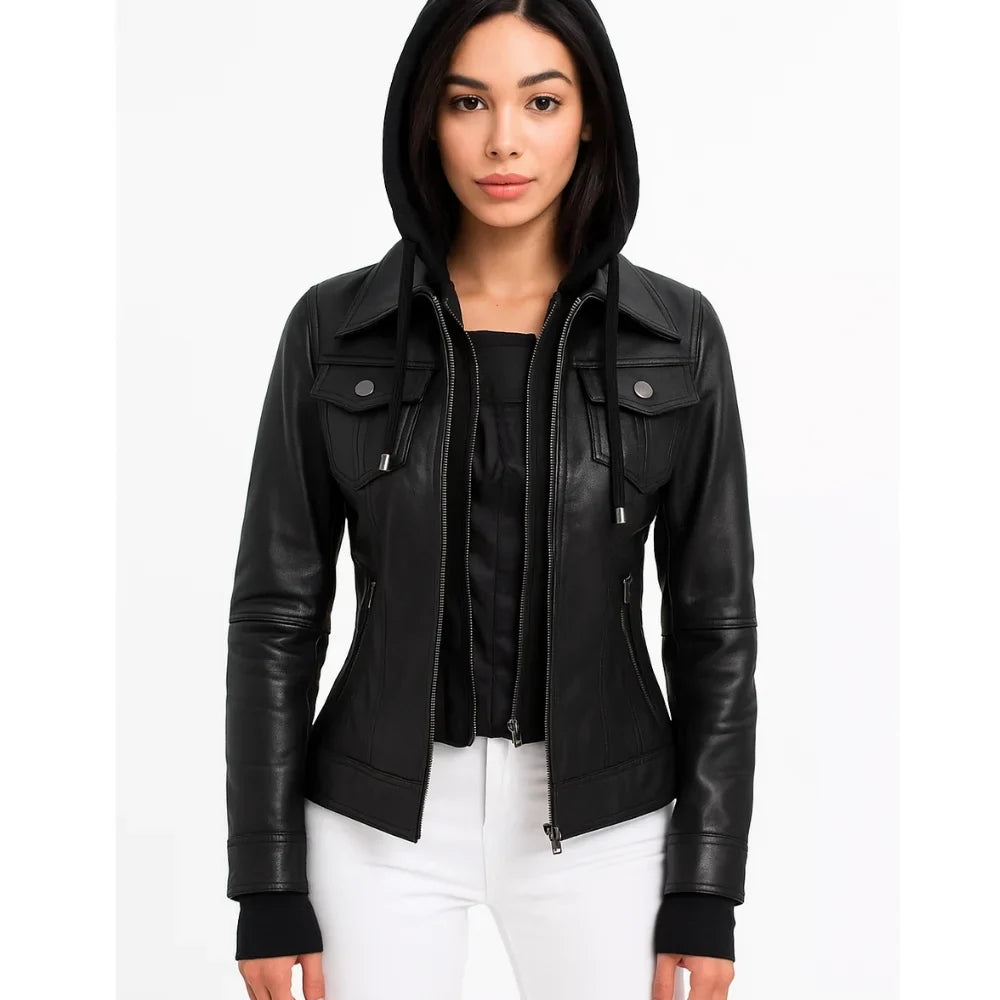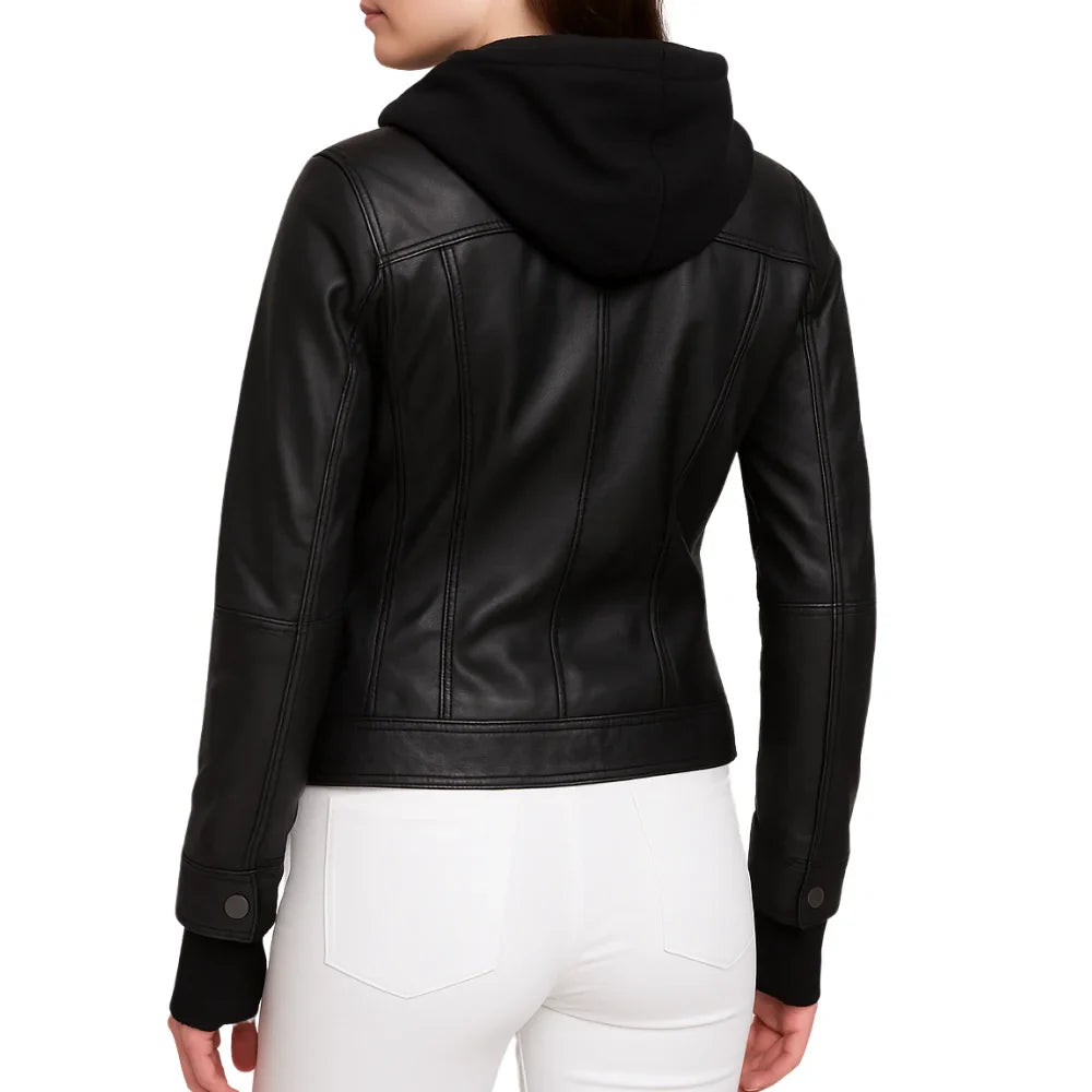 Emmy Black Leather Biker Jacket Women with Removable Hood