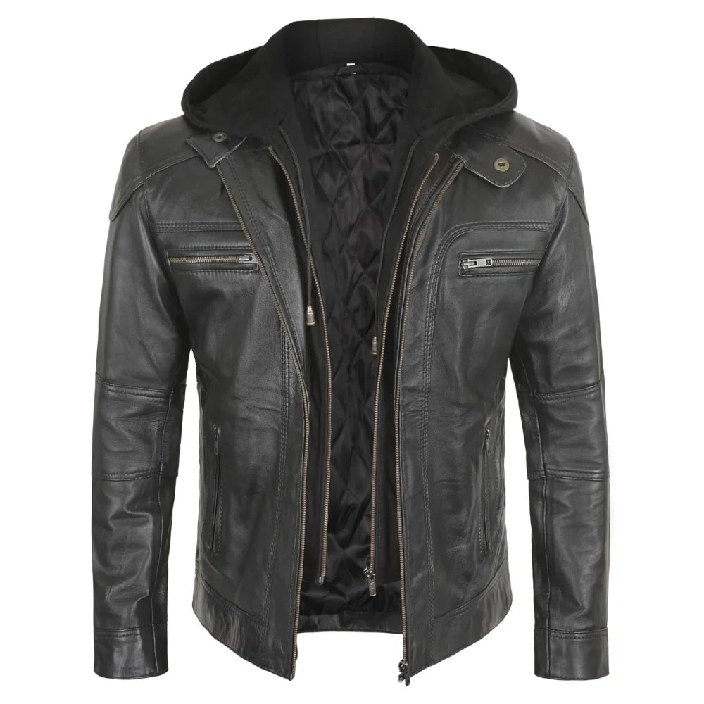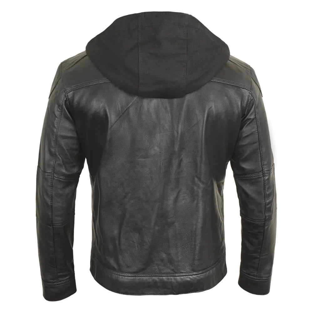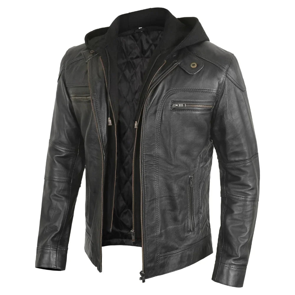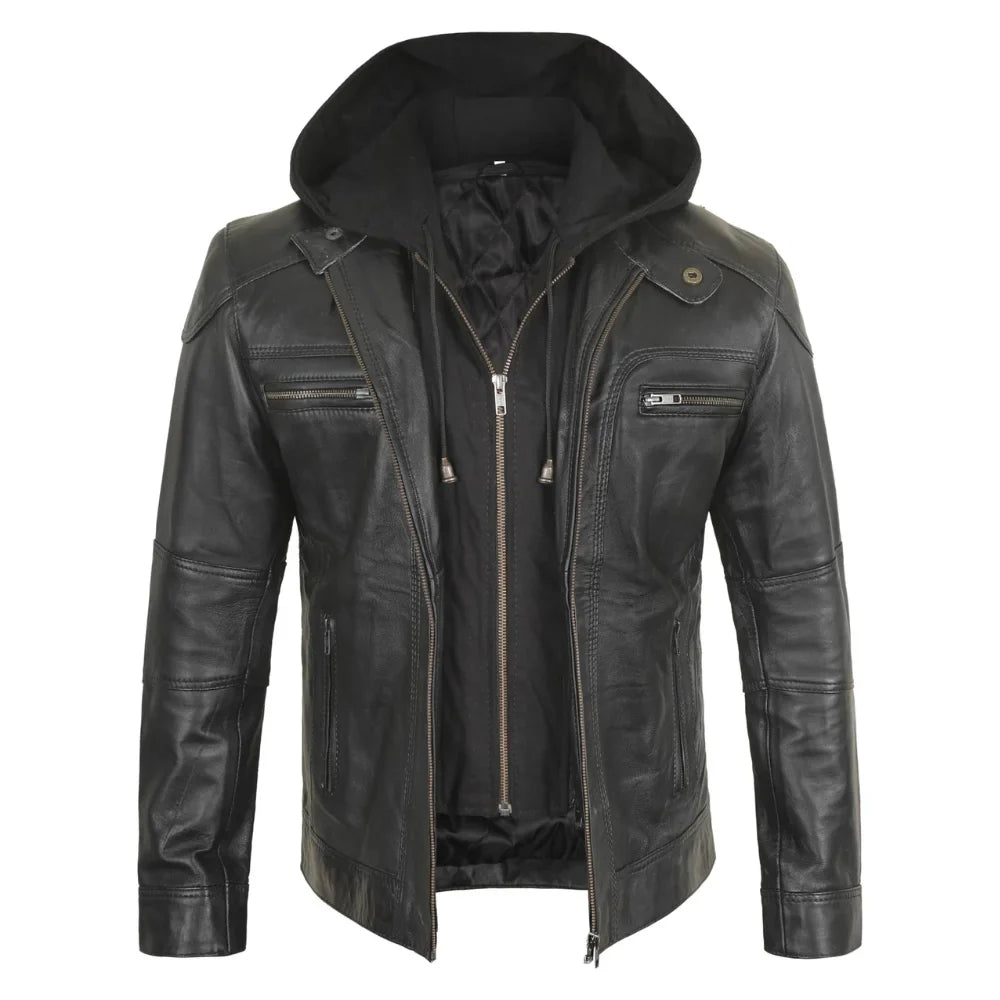 Mens Black Hooded Bker Leather Jacket With Removable Hood