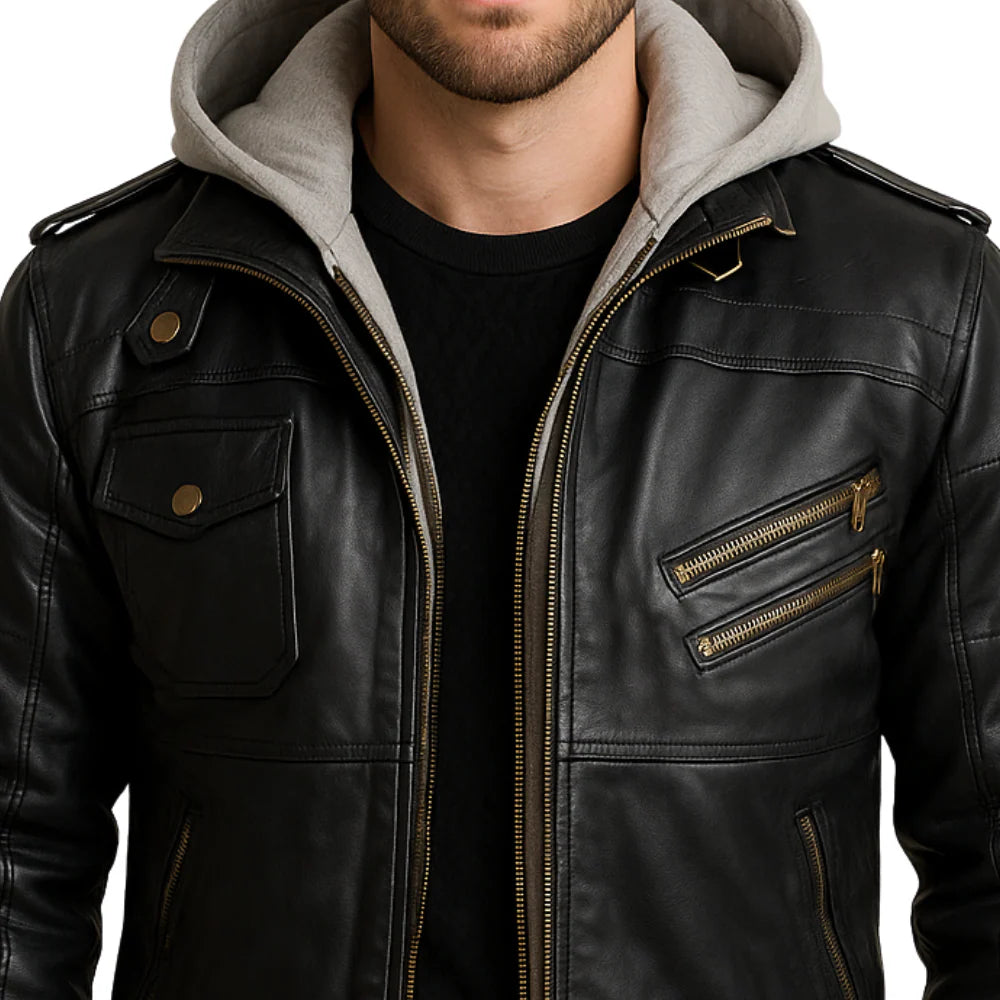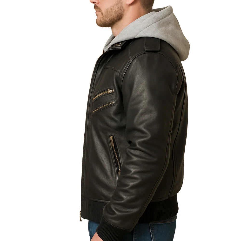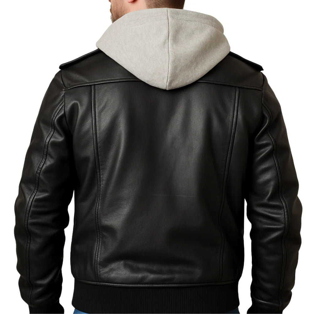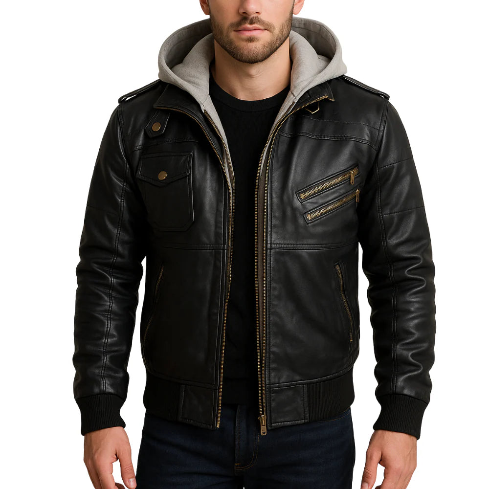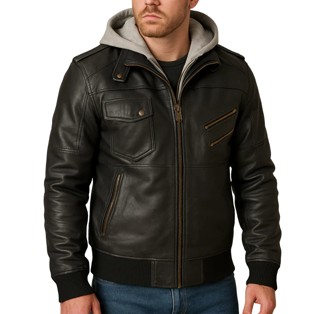 Mens Black Leather Bomber Jacket With Removable Hood