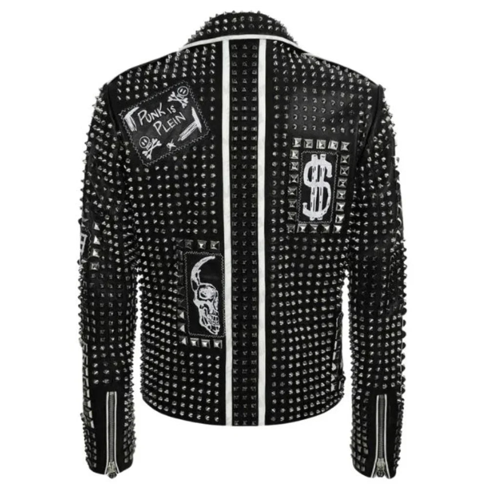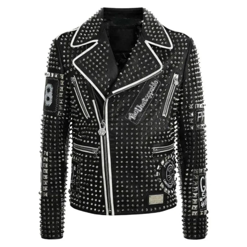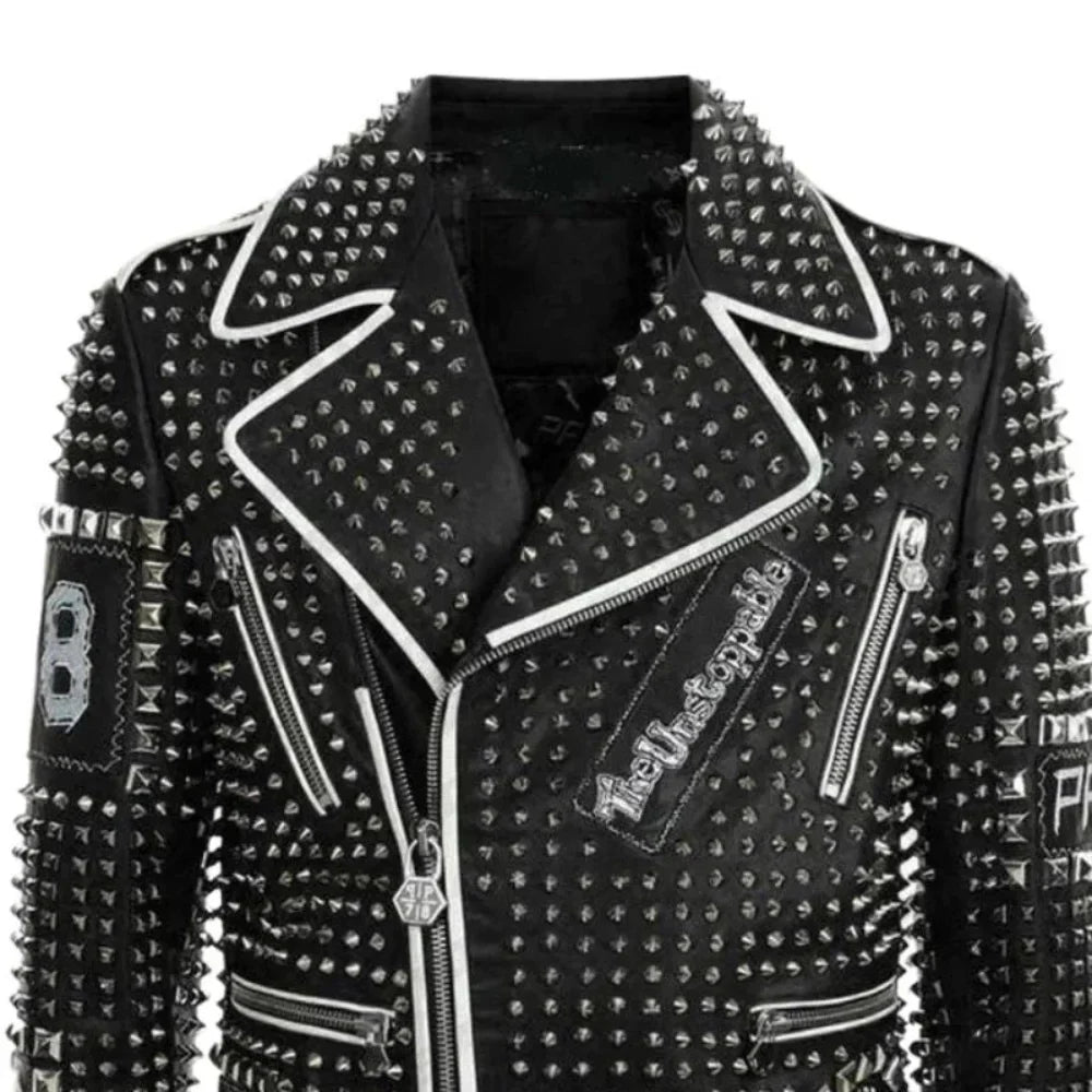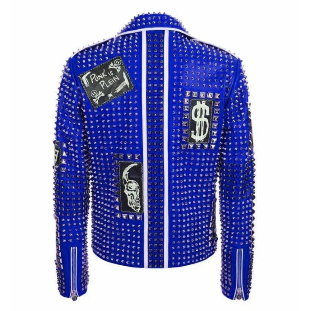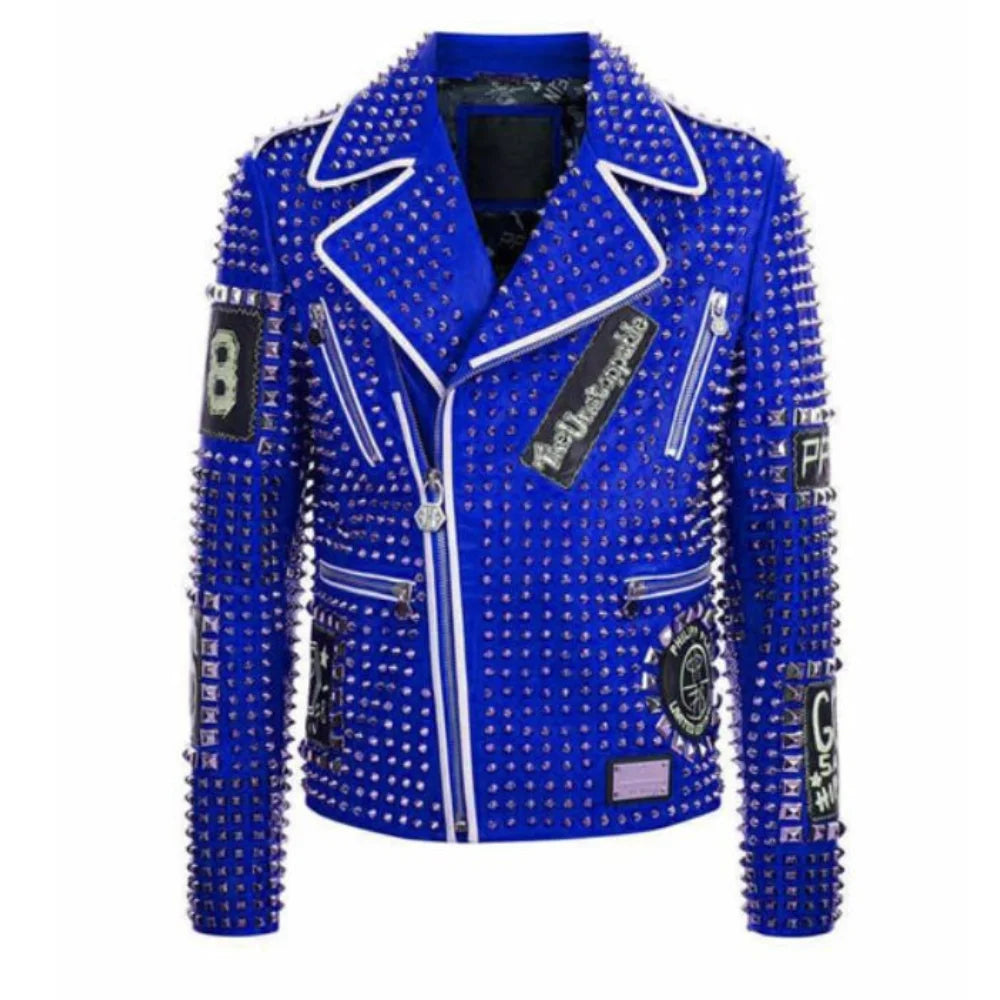 Introducing our Men’s Brando Black & Blue Studded Leather Jacket, a fusion of edgy style & individuality. Crafted from 100% premium leather, featuring trendy white lines & striking silver studs for extra flair. The slanted front zipper & zipper cuffs add a bold touch. Style it with jeans & boots for a rebellious, motorcycle-inspired look, perfect for a night out or a casual gathering. The soft viscose lining, designed for your comfort, ensures you'll feel at ease throughout. With four zippered pockets, including two chest pockets, this jacket combines fashion with functionality, making a statement wherever you go.