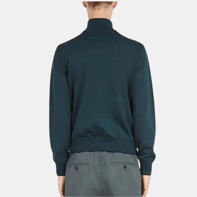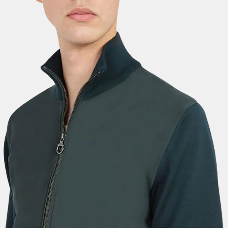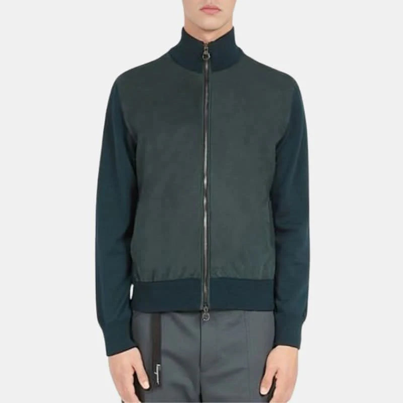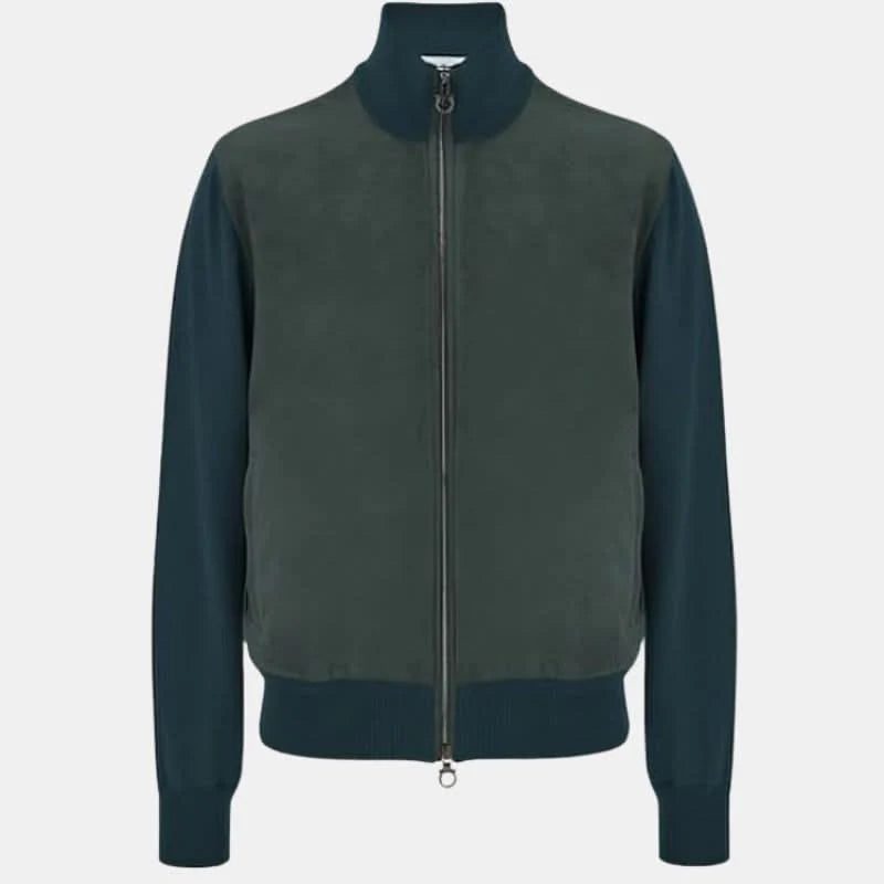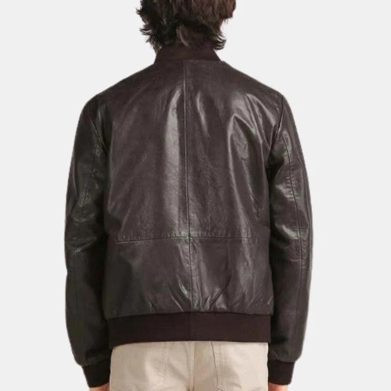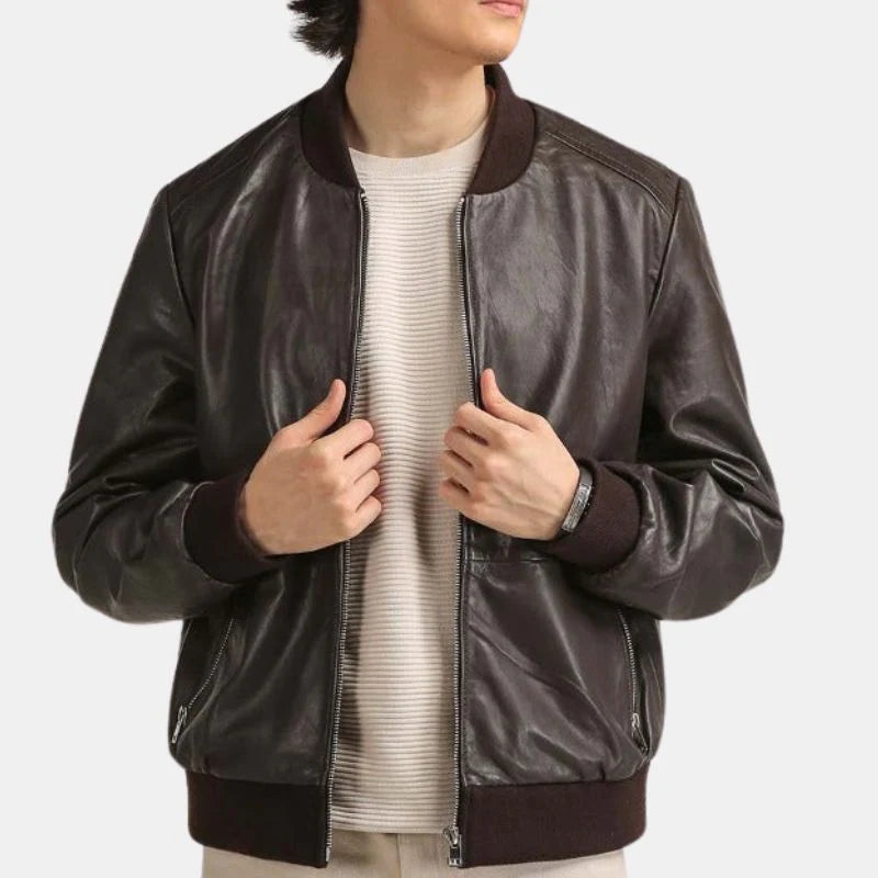 Men's Coffee Brown Leather Bomber Jacket with Rib-Knit Trim