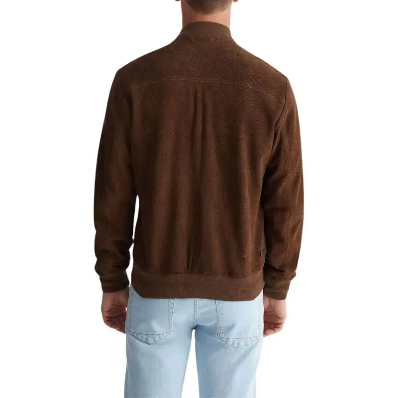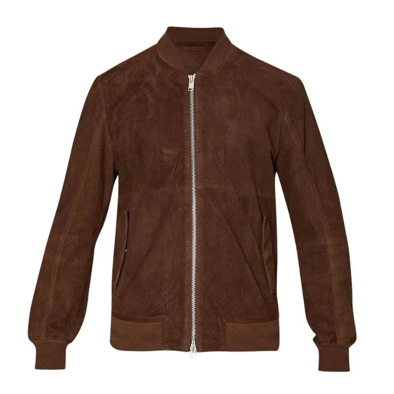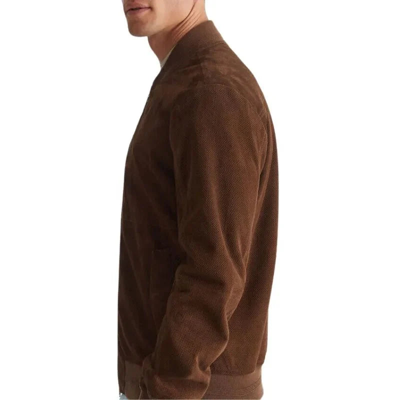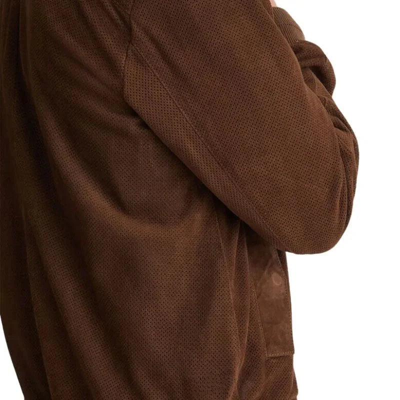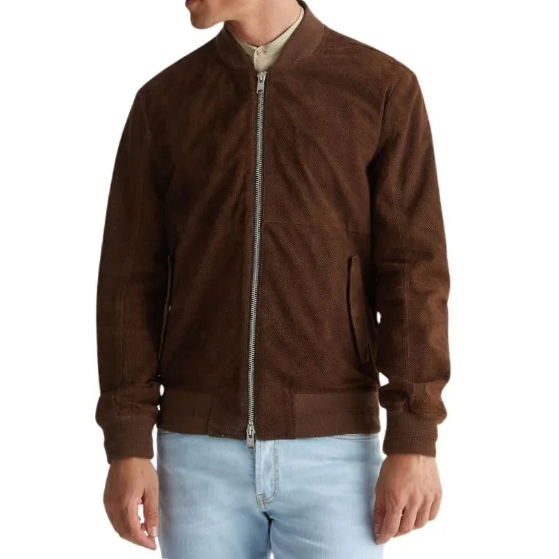 Introducing our Men's Dark Brown Suede Leather Bomber Jacket, crafted with care and attention to detail, this jacket is designed to elevate your look while providing comfort. Made from high quality suede leather which showcases a rich dark brown shade. The soft and supple texture of the suede not only feels luxurious against the skin but also promises durability for years to come. The attention given to crafting this jacket makes it a wardrobe essential that you'll cherish for years.