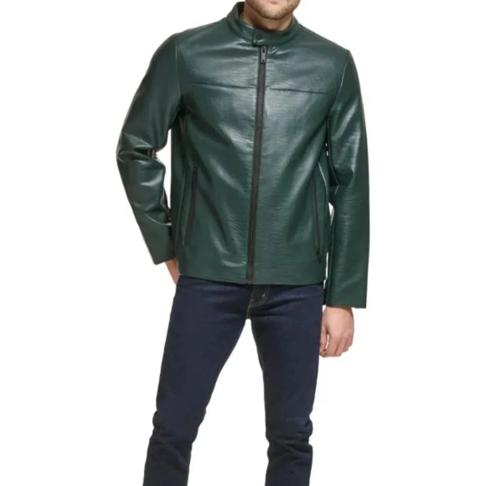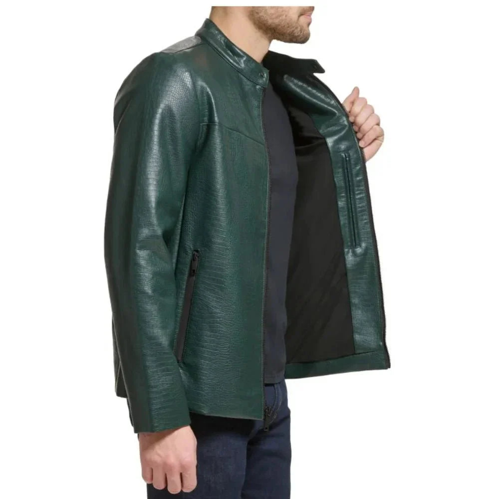 Men's Green Quilted Croco Style Cafe Racer Leather Jacket