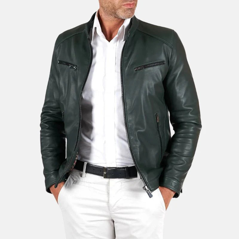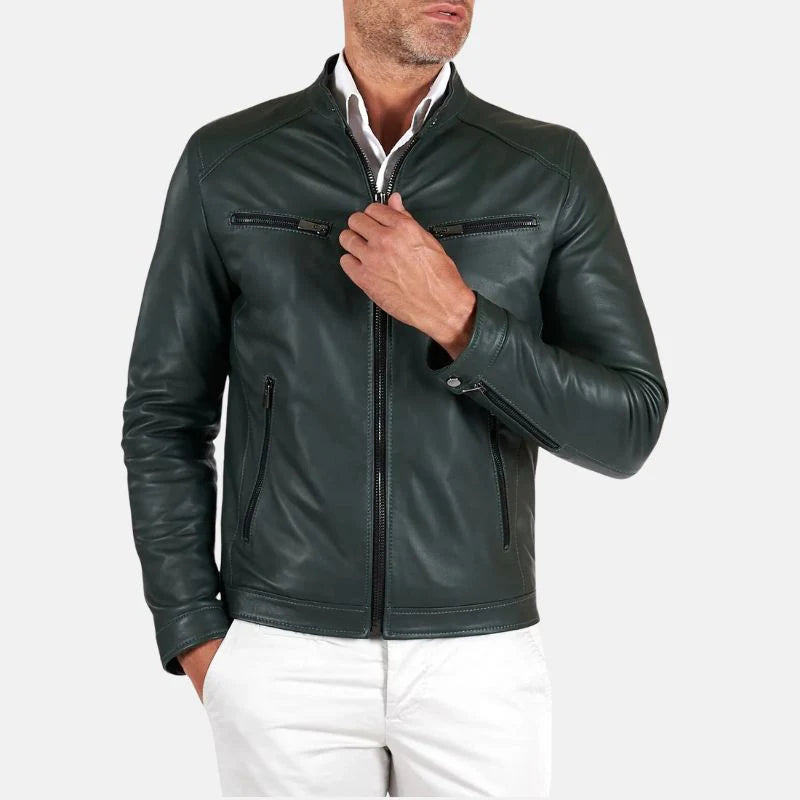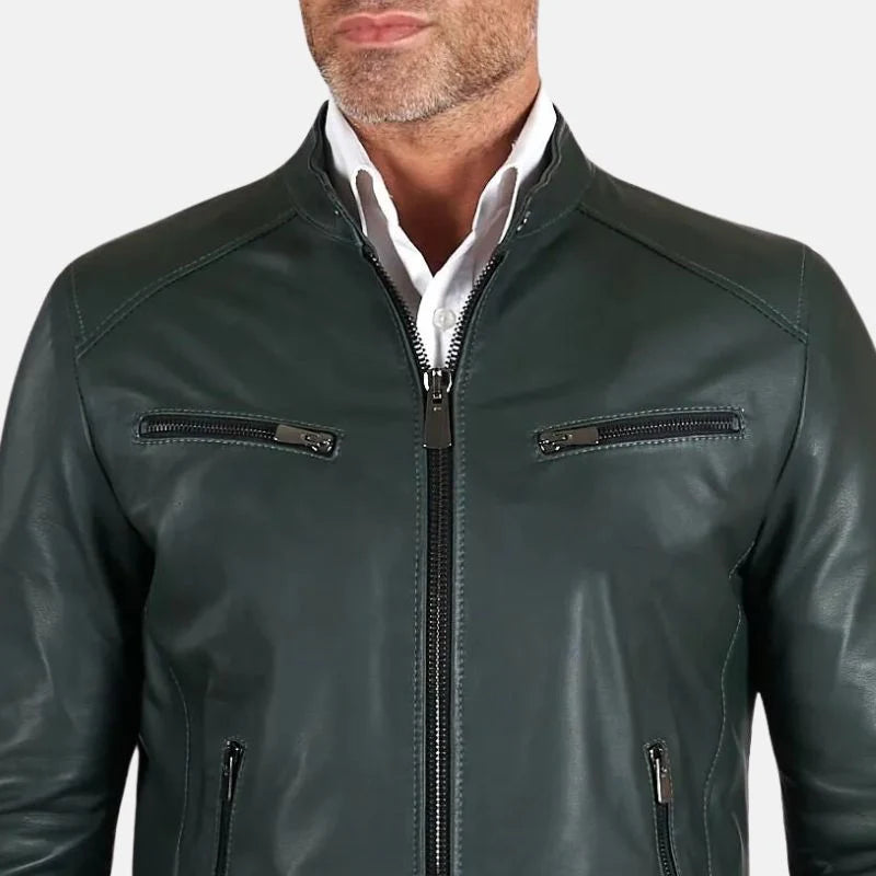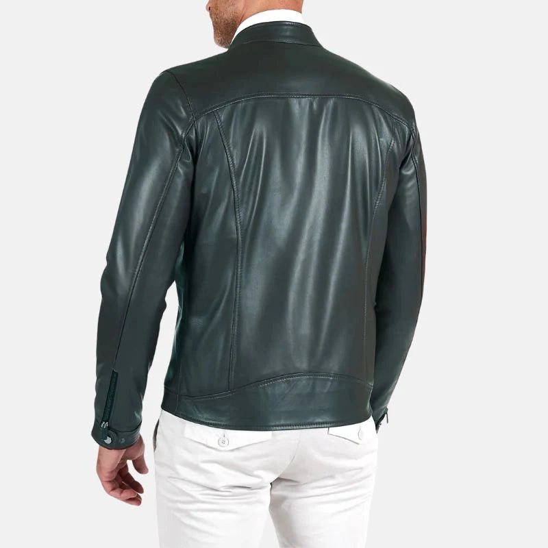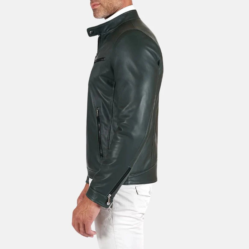 Men's Green Snap Tap Leather Cafe Racer Jacket