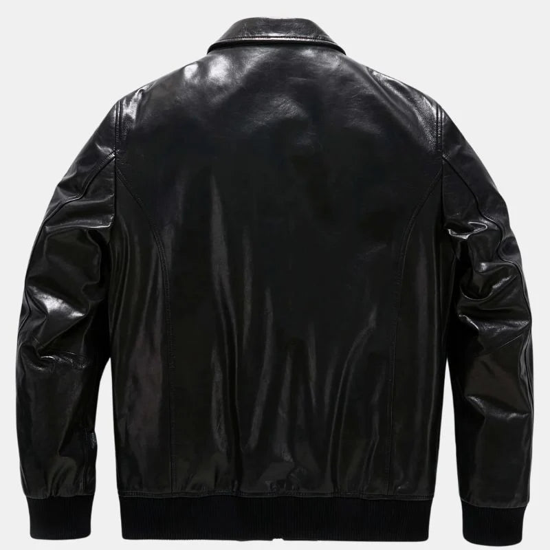 Introducing our Men's Patched Black Bomber Leather Jacket – a classic blend of style & comfort. Crafted from premium leather with a soft viscose inner lining, it features a zipper closure, shirt collar, & rib-knitted cuffs & hemline. Complete with practical pockets, it effortlessly combines function & fashion. You can pair it with distressed jeans & a white tee for a cool, laid back look. Finish with boots or sneakers for versatile styling. Its perfect for casual outings, weekend gatherings, or a night out, this jacket adds rugged sophistication to your wardrobe, making a statement wherever you go.