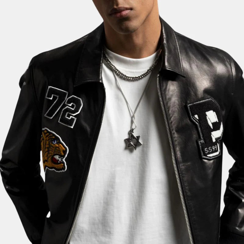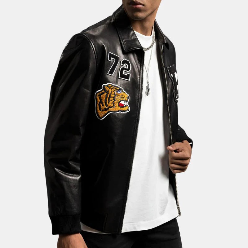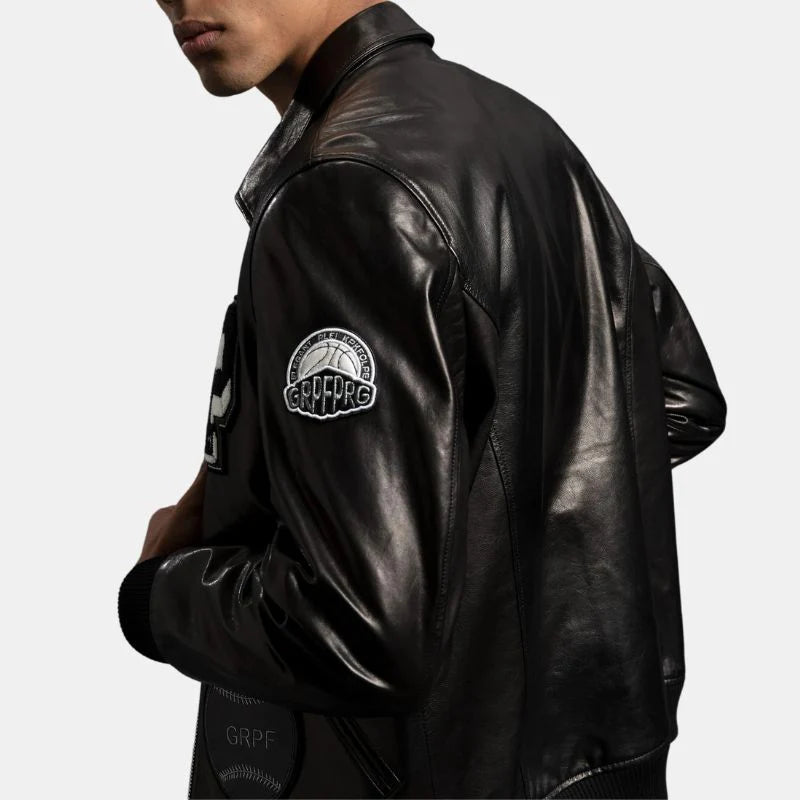 Black Bomber Varsity Leather Jacket With Patches For Mens
