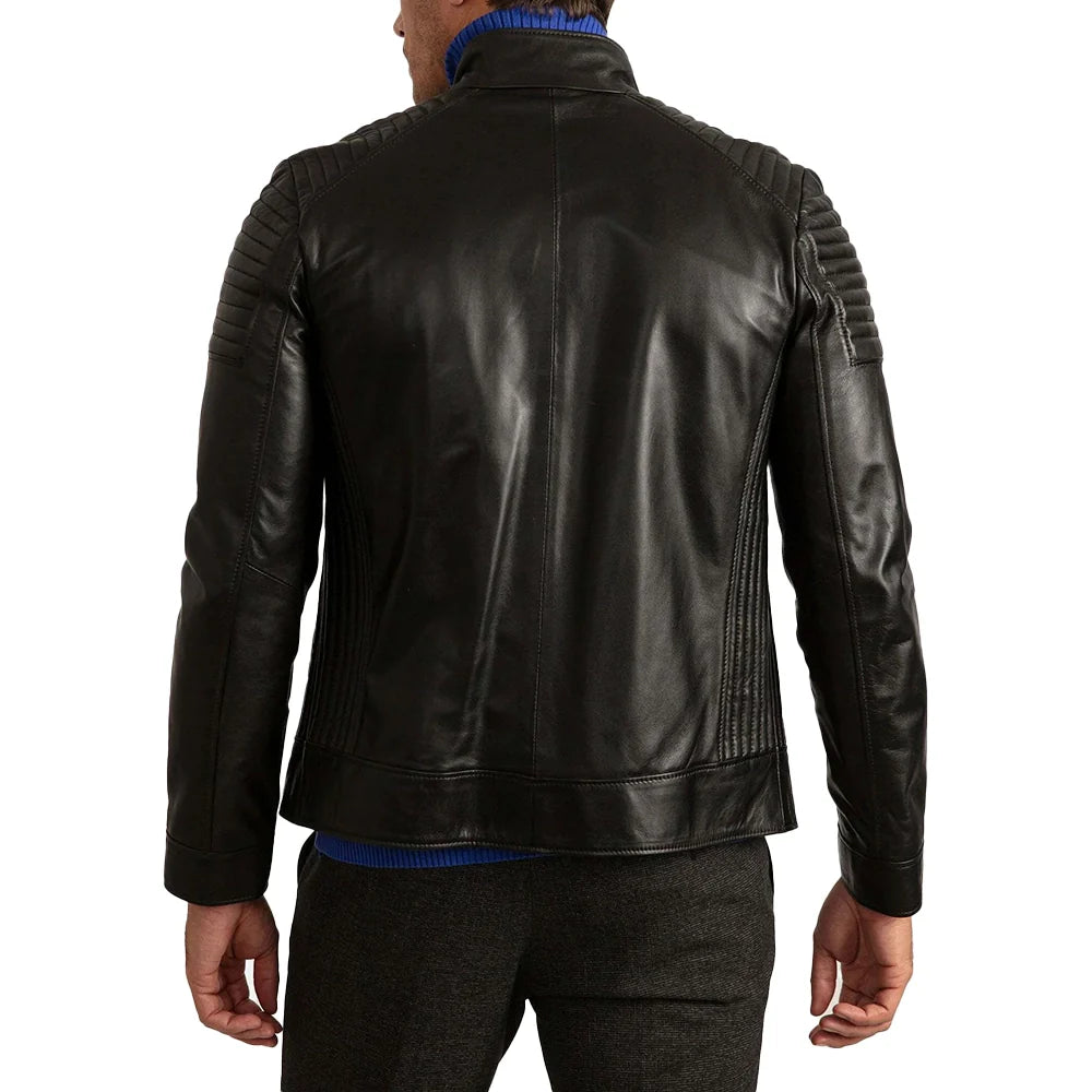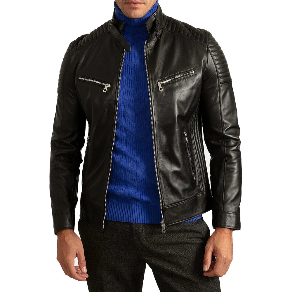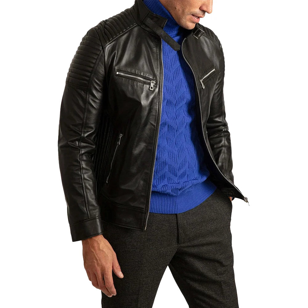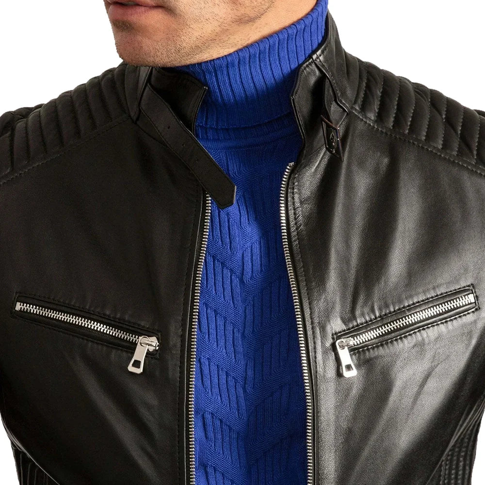 Mens Signature Black Leather Cafe Racer Motorcycle Jacket