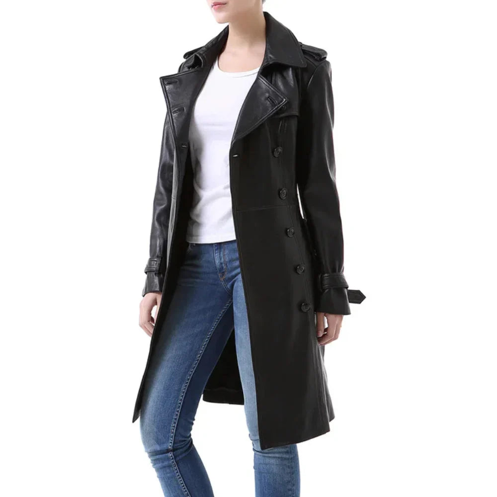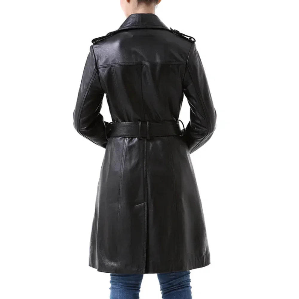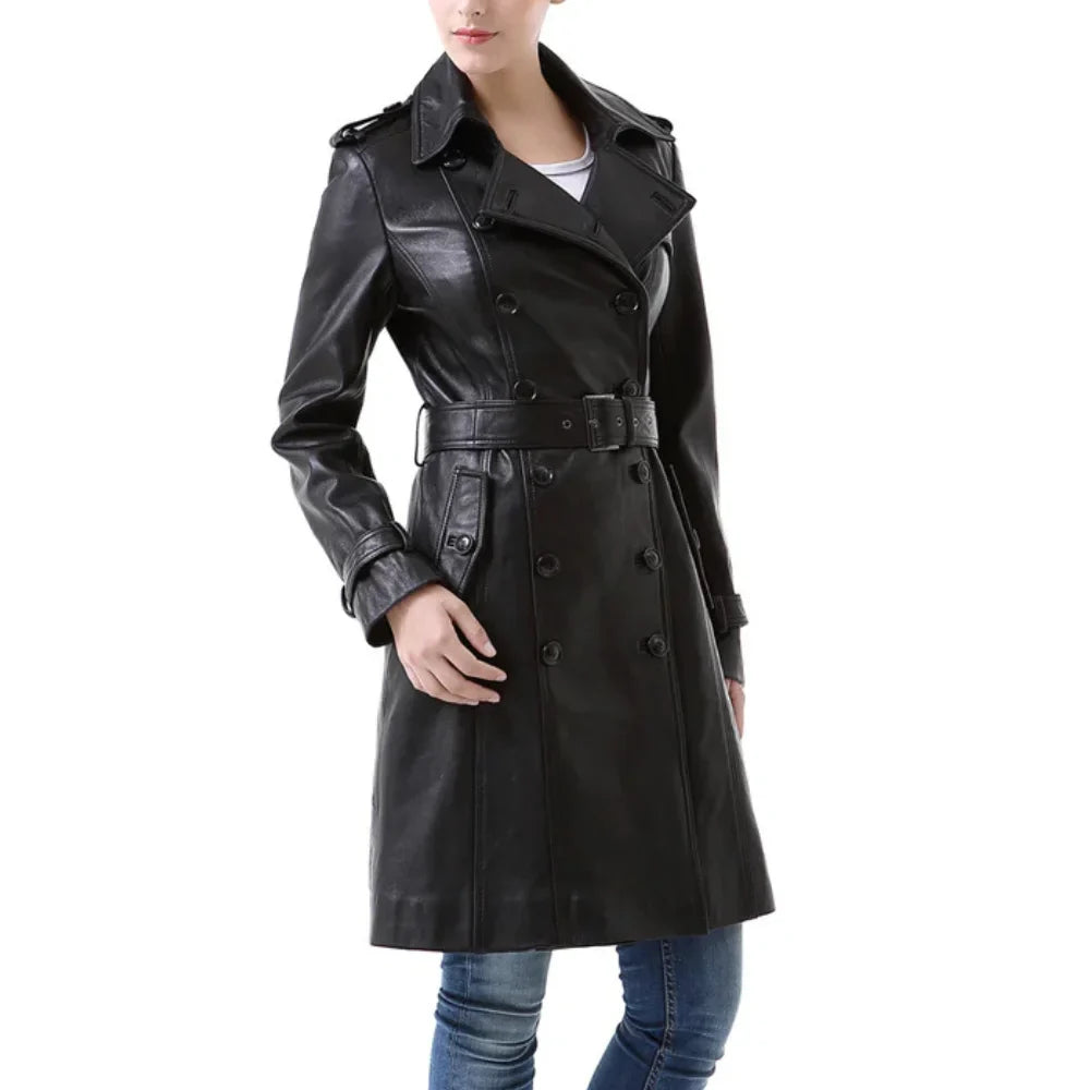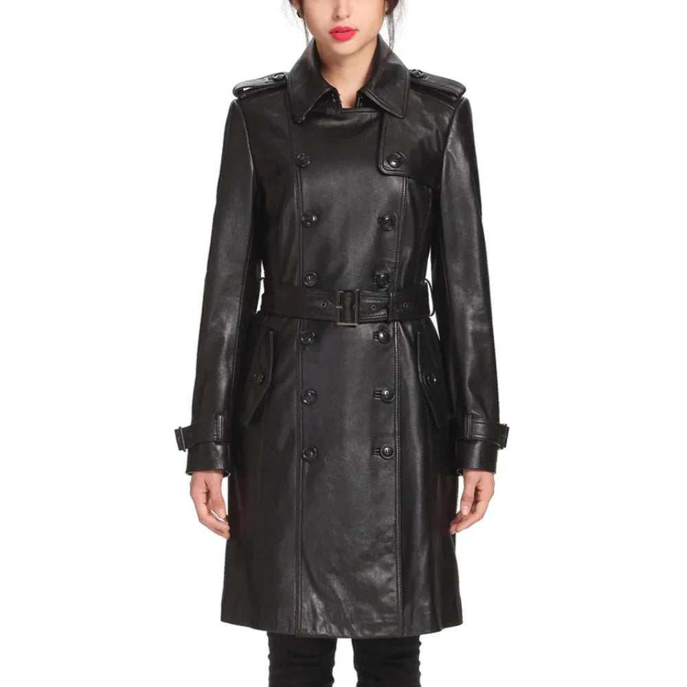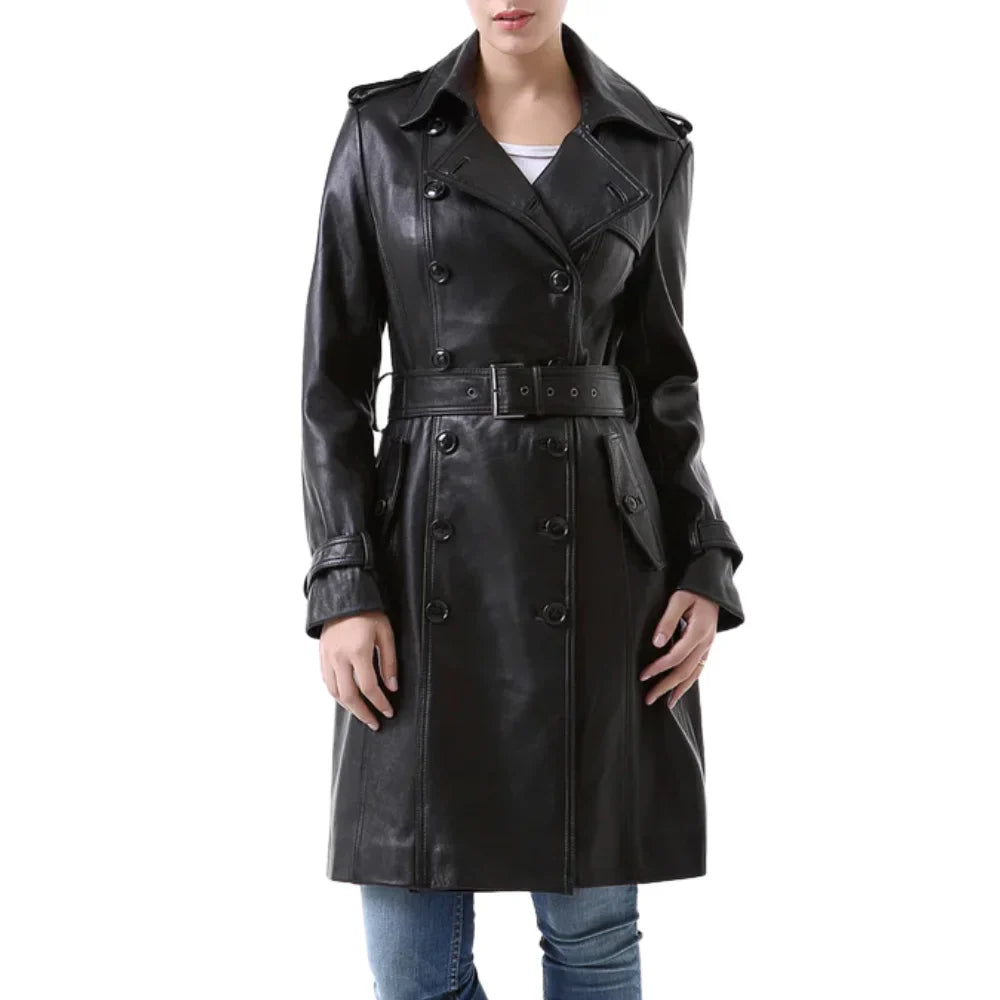 NewYork Women's Black Lambskin Double Breasted Belted Trench Coat