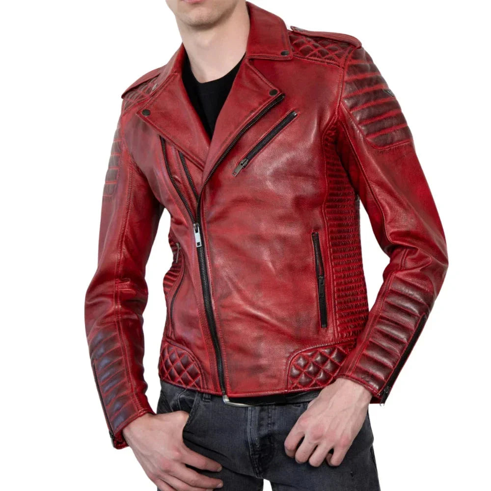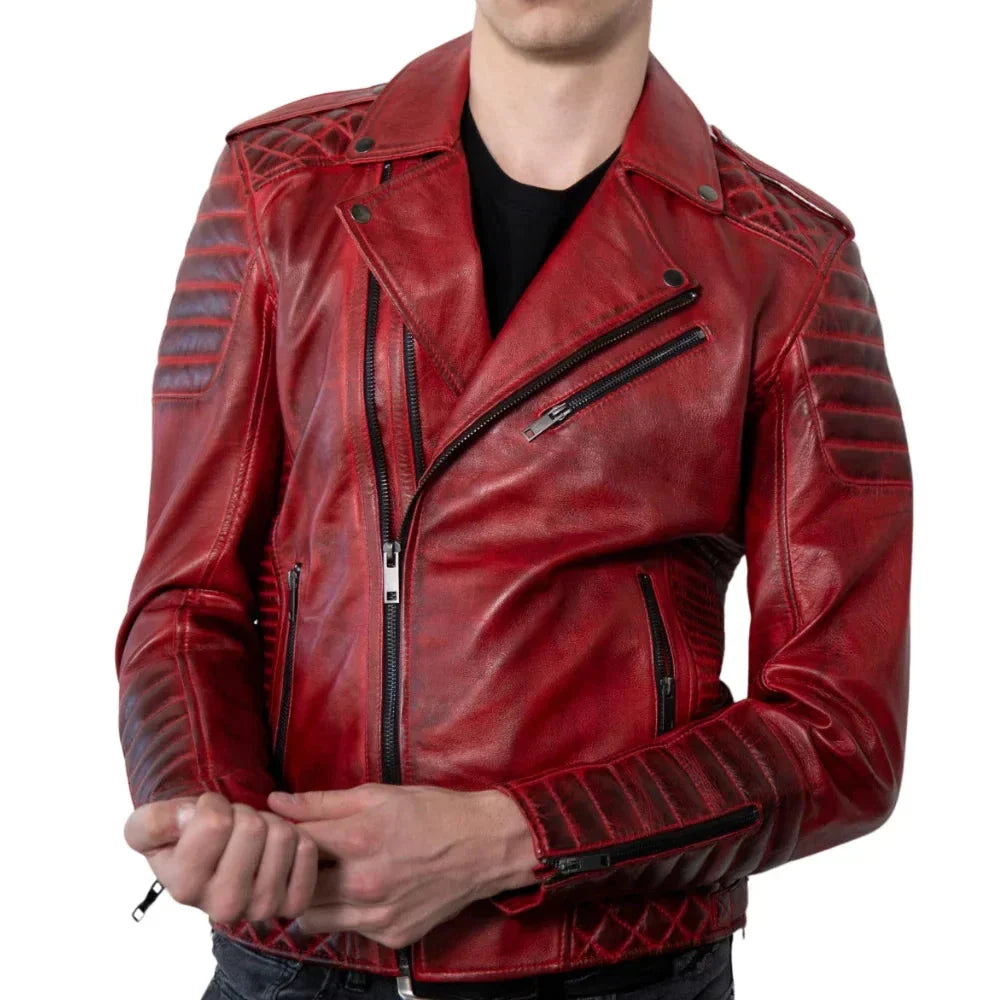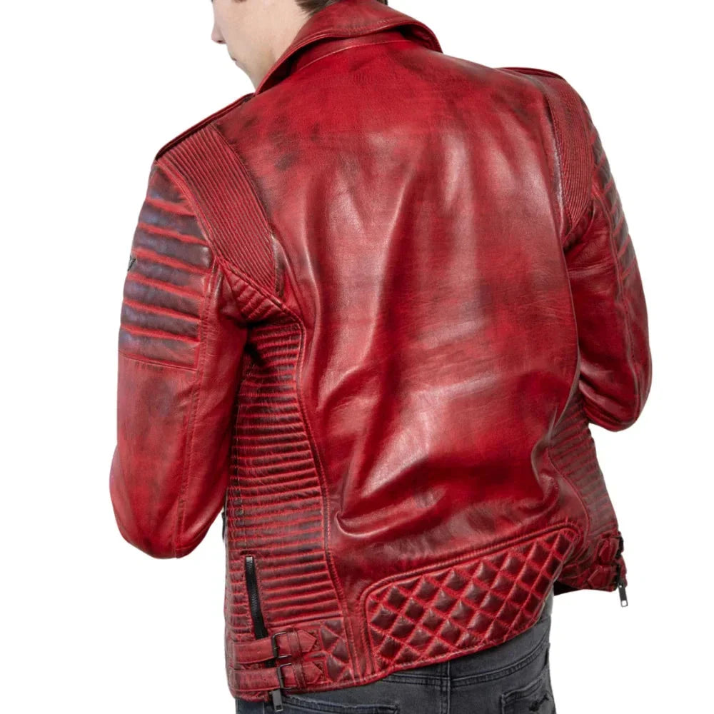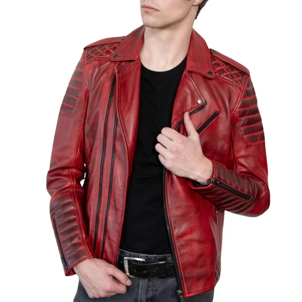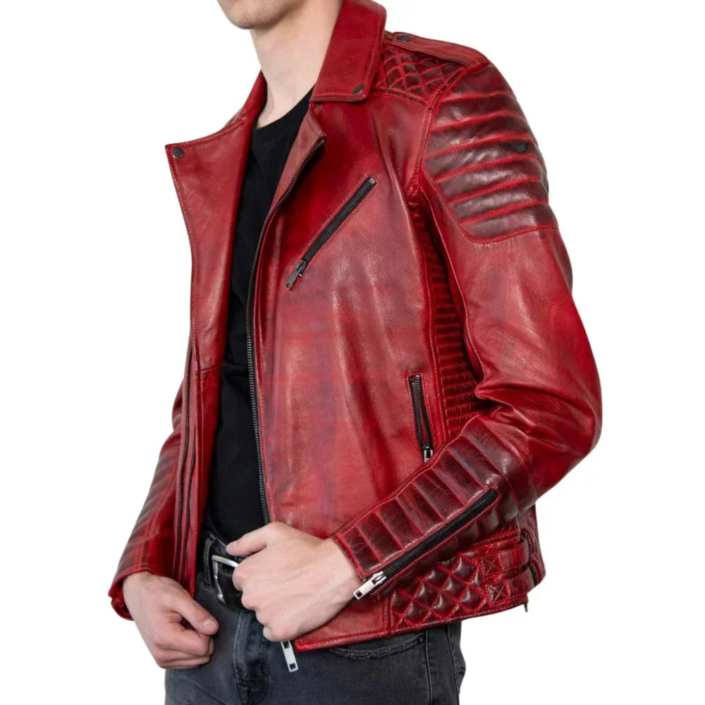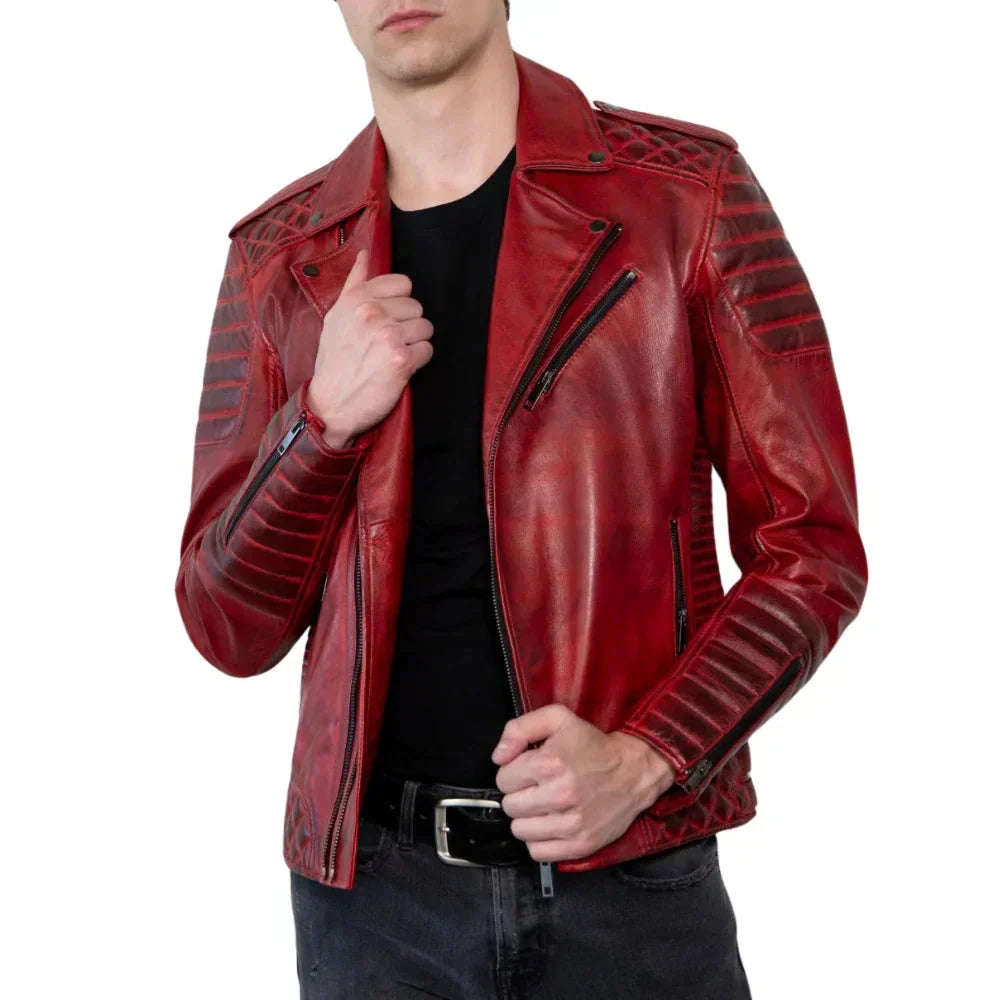 Red Real Leather Biker Jacket Men's with Quilted Details
