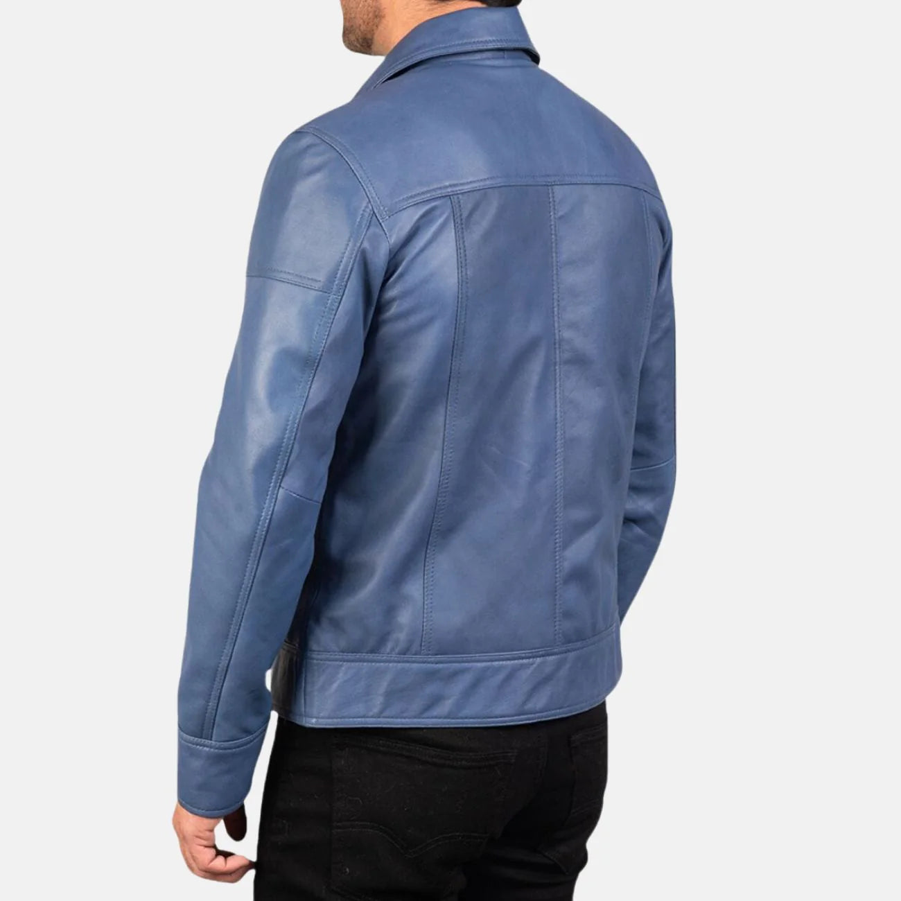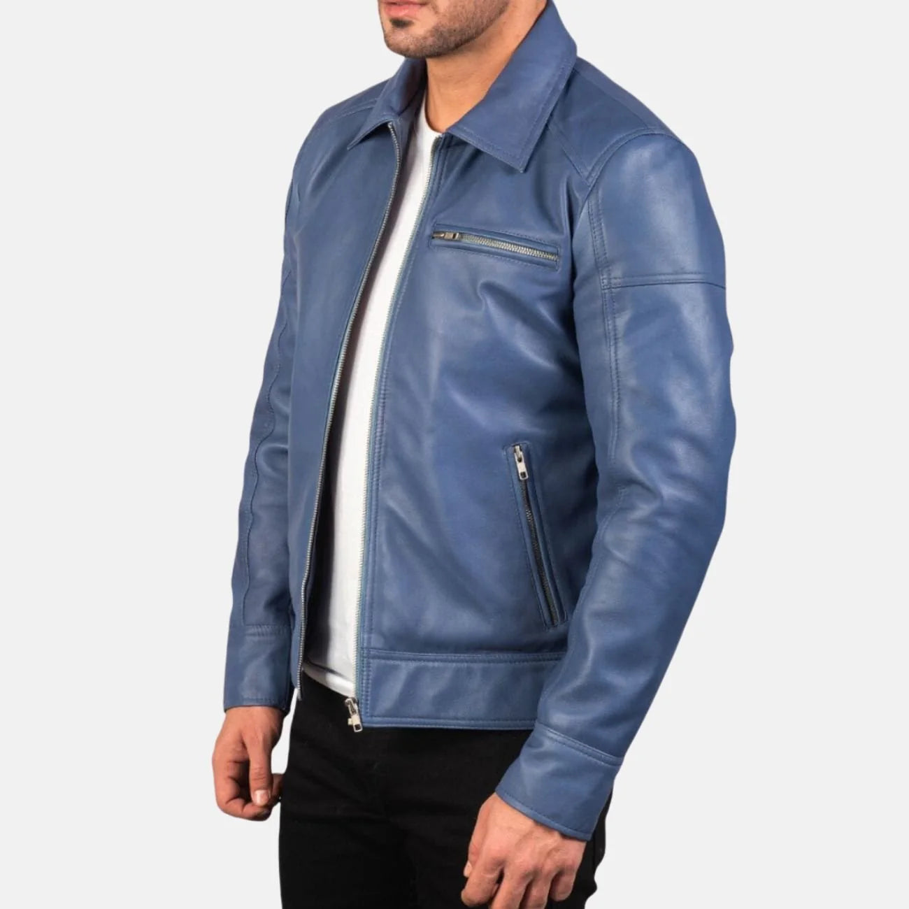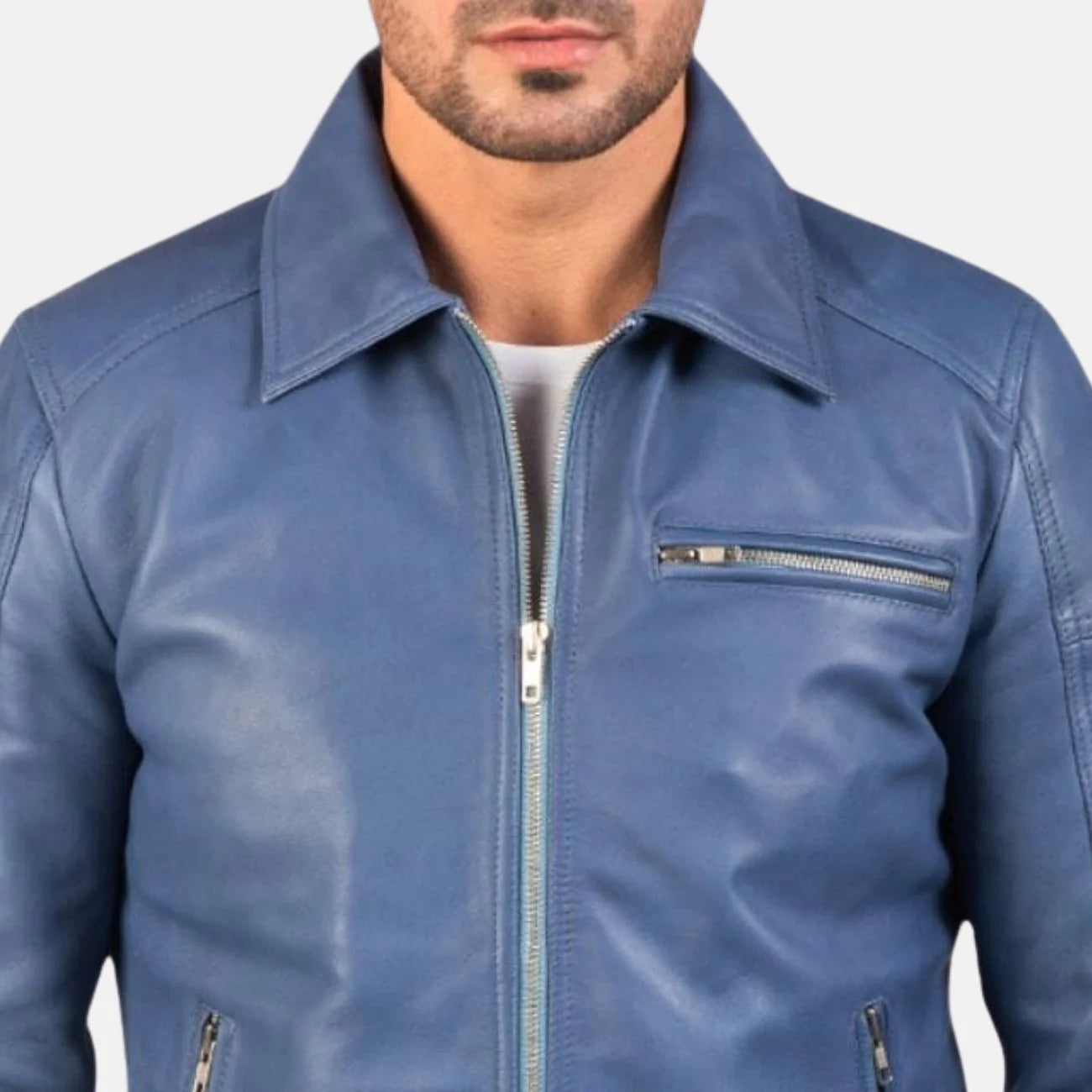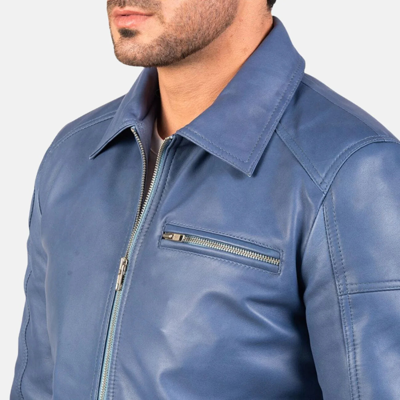 Shirt Collar Blue Leather Jacket Mens