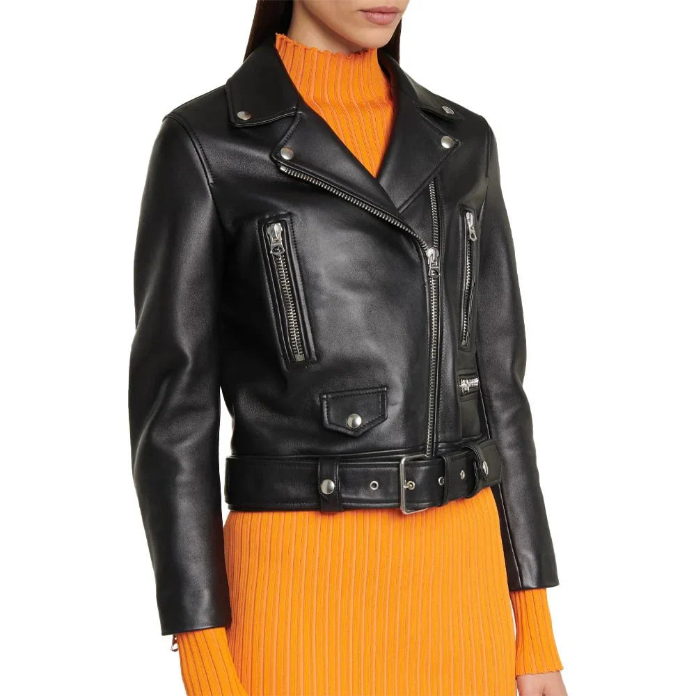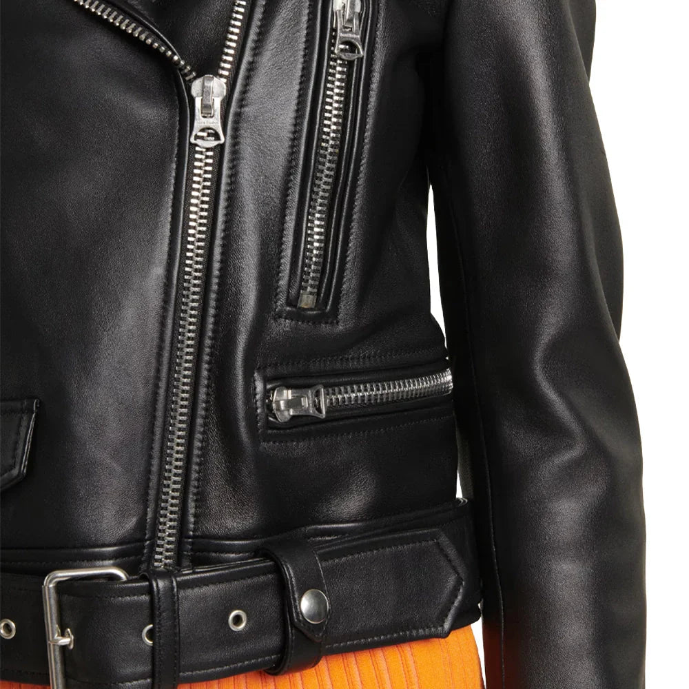 Our slim-fitting, belted black motorcycle jacket is perfect for women who want to make a statement. Crafted from premium leather for protection and durability, this sleek design is breathable and stylish for any occasion. Perfect for a night on the town or a weekend ride. Designed to combine protection and durability with a slim, fashionable fit, this premium leather jacket is the perfect outerwear choice for women who want to add a touch of sophistication to their wardrobe. The subtle design is breathable and stylish for any occasion - perfect for any adventure.