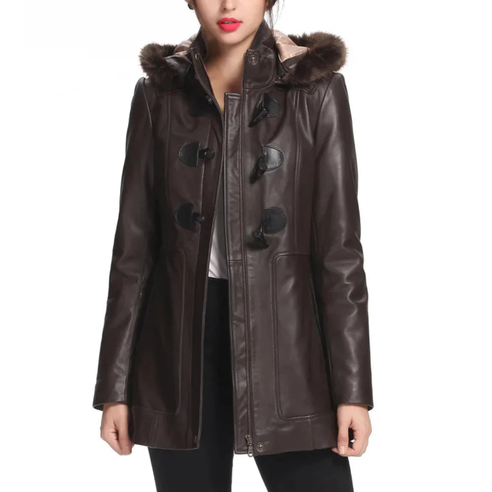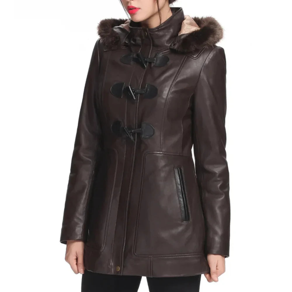 The Amanda Toggle Coat blends timeless charm with modern versatility. Crafted from buttery-soft New Zealand lambskin, it offers a sleek silhouette with thoughtful details like a YKK zip, snap placket, and playful toggle accents. A removable hood lets you switch from minimal and polished to cozy and dramatic in seconds. The insulated zip-out liner adds warmth when you need it and removes easily for lighter wear in milder weather. A refined leather coat designed to carry you from crisp mornings to late nights with comfort and confidence.