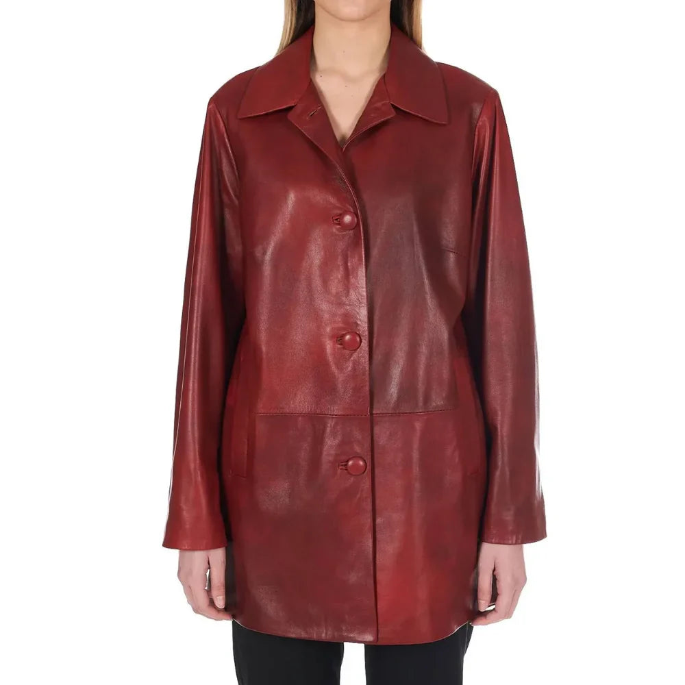 Women’s Leather Button-Up Burgundy Real Leather Coat