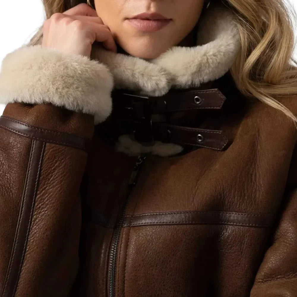 Get ready for the cold season and look sharply fashionable in the Brown Leather Jacket with Shearling Lining for Women. Featuring a classic look that is sure to last for many years, this style boasts a genuine leather shell and a cozy shearling lining. The functional aspects include: the collar flap with buckle that allows one to adjust heat, ribbed shearling cuffs to give that classy and neat look, and bottom pockets to ensure security of items. This aviator jacket is one that you will be able to wear several times in the year and is timeless in style.