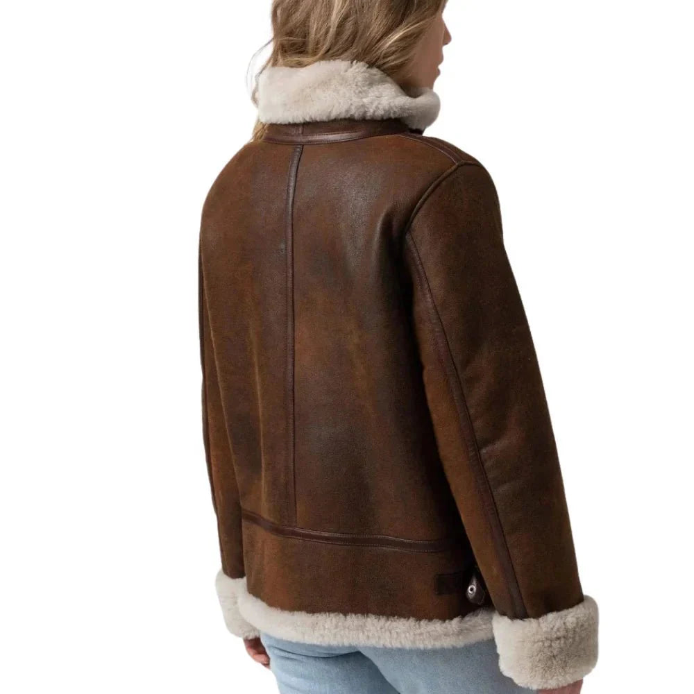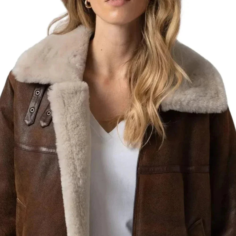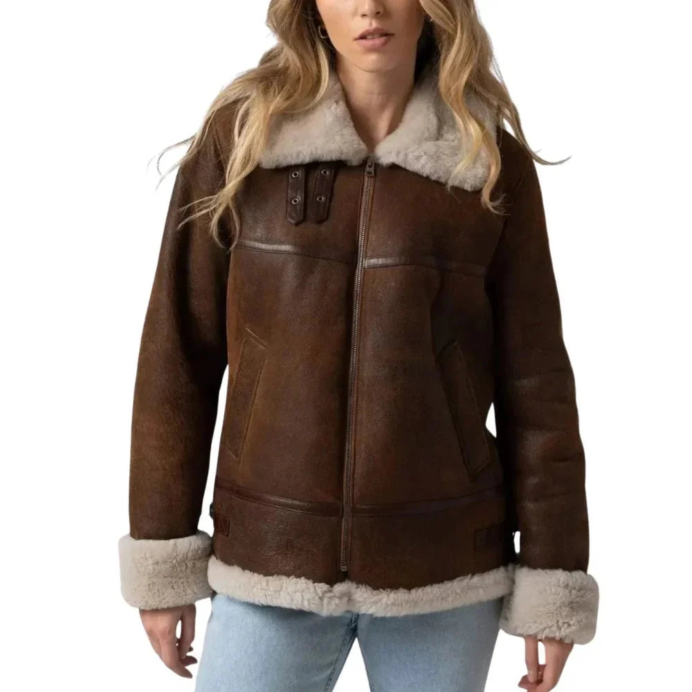 Get ready for the cold season and look sharply fashionable in the Brown Leather Jacket with Shearling Lining for Women. Featuring a classic look that is sure to last for many years, this style boasts a genuine leather shell and a cozy shearling lining. The functional aspects include: the collar flap with buckle that allows one to adjust heat, ribbed shearling cuffs to give that classy and neat look, and bottom pockets to ensure security of items. This aviator jacket is one that you will be able to wear several times in the year and is timeless in style.