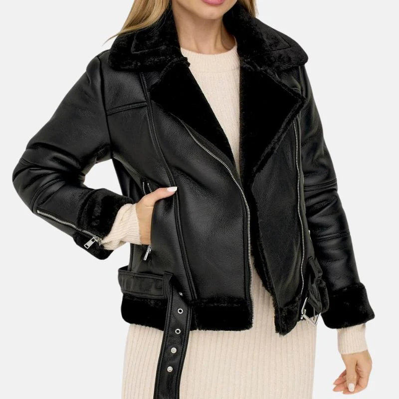 Get ready to slay the winter fashion game in this stunning biker-style black shearling jacket for women. Crafted from supple lambskin leather and featuring a soft shearling lining, it's the epitome of both style and warmth. The silver-tone detailing, with zippers, buckles, and pockets, adds an extra dash of sophistication to this wardrobe essential. Embrace the cold season with confidence in this womens aviator jacket, sure to make you stand out in style.