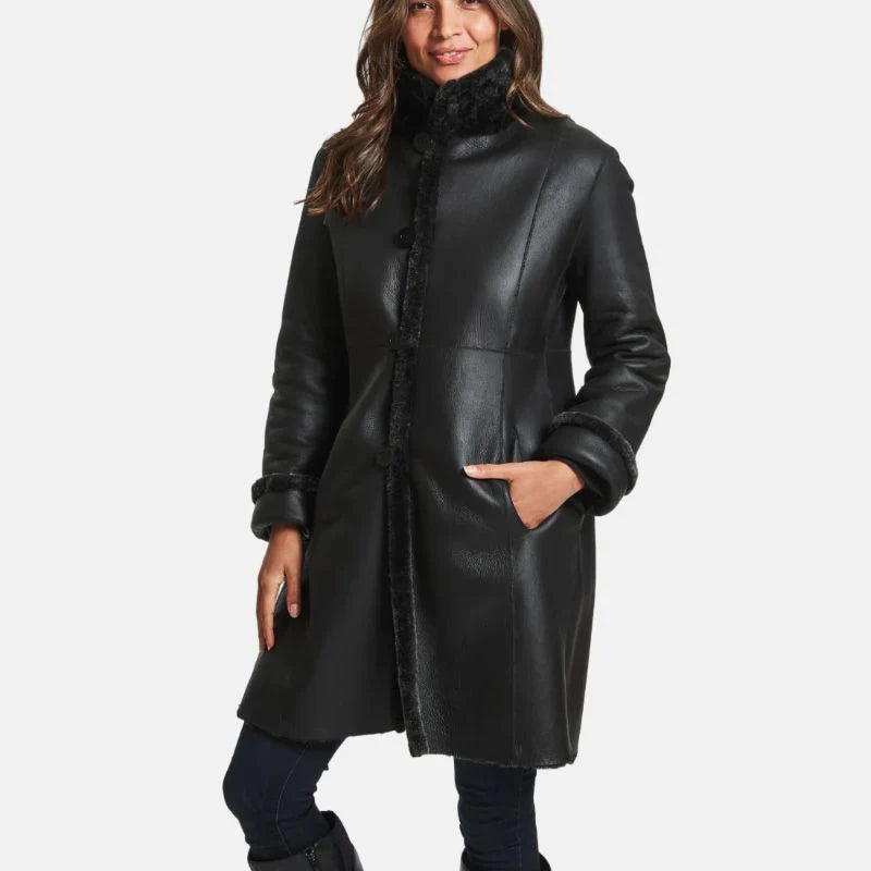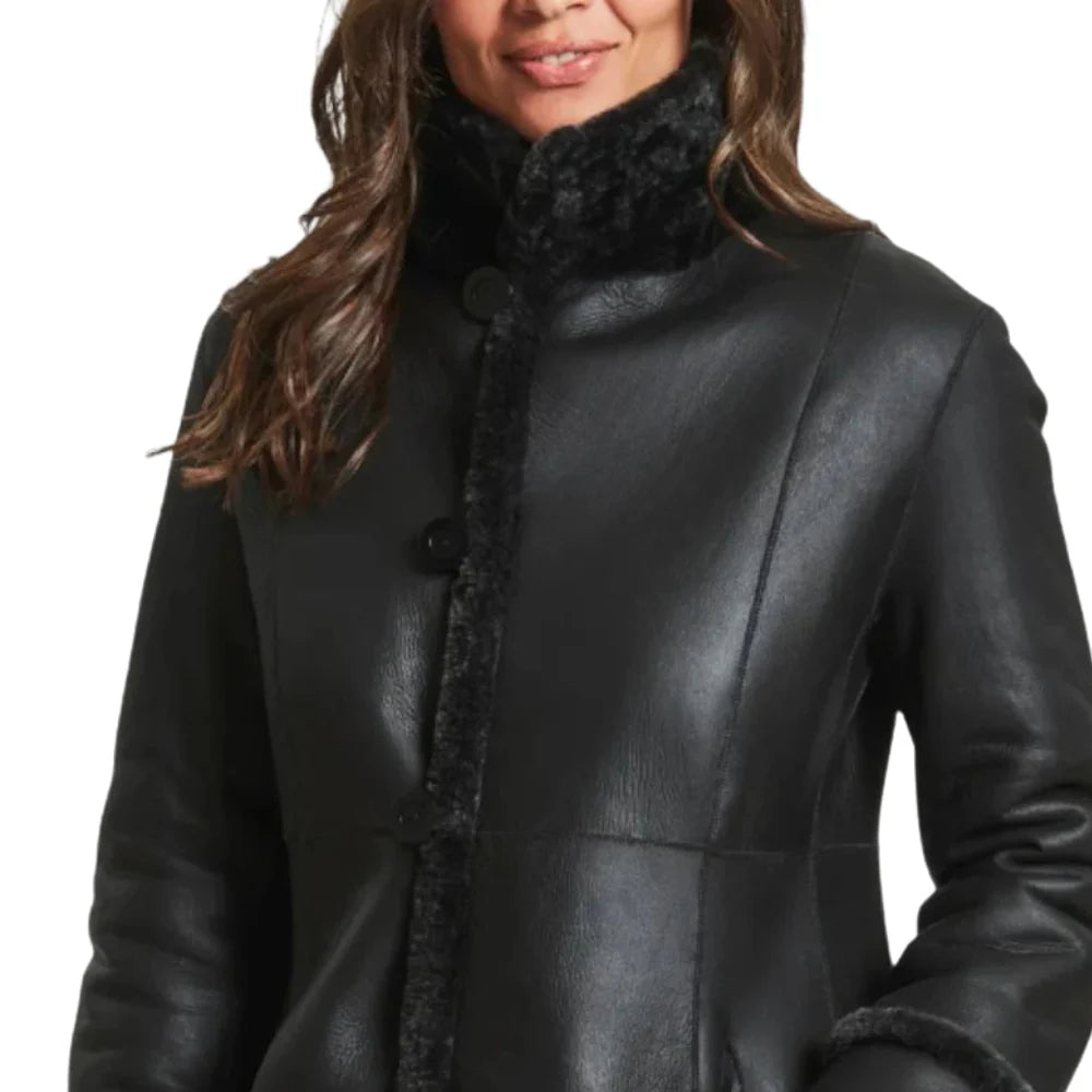 Discover warmth and style in our Victoria Victoria Women's Black Leather Shearling Winter Coat. Crafted with precision, this coat is more than winter wear; it’s a versatile statement for any occasion. Luxurious black leather meets plush shearling for durability and a touch of elegance. The flattering long length adds, making it a go-to choice whether you’re dressing up for an event or embracing casual chic. The attention to detail shines through in the luxurious shearling collar, framing your face with elegance. Stay snug with the front closure, ensuring you’re stylishly shielded from the winter chill. At trendyjacket.com, we understand the importance of enduring style. Shop now for our Leather Shearling Long Black Coat – the perfect fusion of fashion, warmth, and timeless elegance.