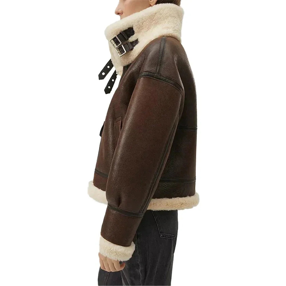 Check out our Women's Chocolate Brown B3 Sheepskin Aviator Jacket—a cozy & stylish outerwear choice. Crafted from 100% premium leather, this lady's leather aviator jacket features a soft, shearling fur lining that keeps you warm & comfortable. A shearling hood & fur-trimmed cuffs complement its classic aviator bomber style. The front zipper closure adds convenience, & you’ll find ample storage with two outer side pockets & an inner pocket. Stay warm & fashionable with this chic brown aviator jacket!