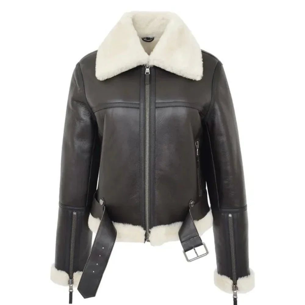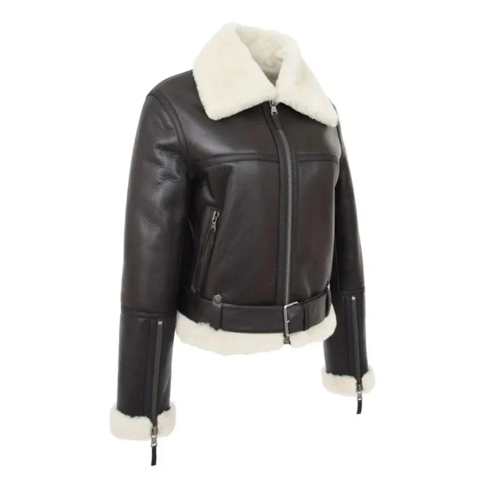 Womens Sheepskin B3 Belted Black Leather Shearling Jacket Aviator