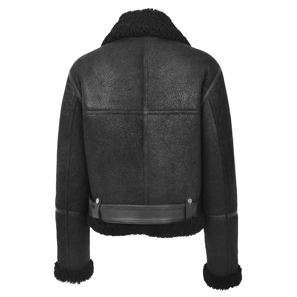 Women's Sheepskin Belted Black Leather Aviator Jacket