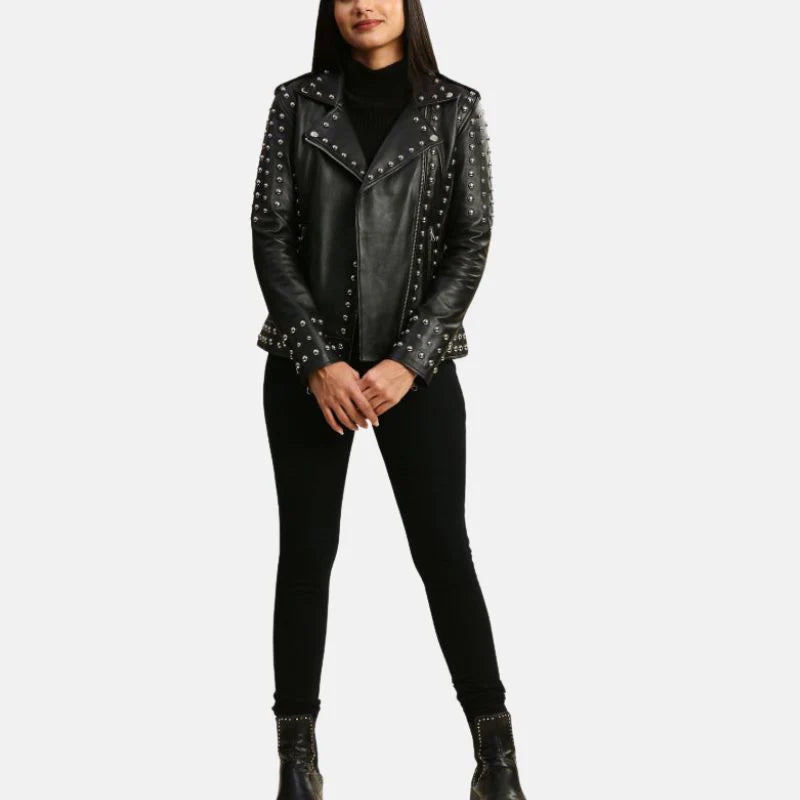 Rev up your style with our Womens Studded Motorcycle Black Punk Leather Jacket. Crafted from 100% premium leather, this edgy piece features an intricate studded design for a punk-inspired vibe. The soft viscose inner ensures comfort, while the front zipper closure & zipper cuffs add a touch of rebellious flair. With three zipper pockets outside & one inside, it's as practical as it is stylish. Embrace your inner rocker by pairing this jacket with distressed skinny jeans & a graphic tee. Finish the look with ankle boots & statement accessories for an effortlessly chic punk aesthetic. Whether you're hitting a concert, going for a night out with friends, or simply want to make a bold fashion statement, this Black Studded Punk Leather Jacket is your go-to for a daring and stylish look.