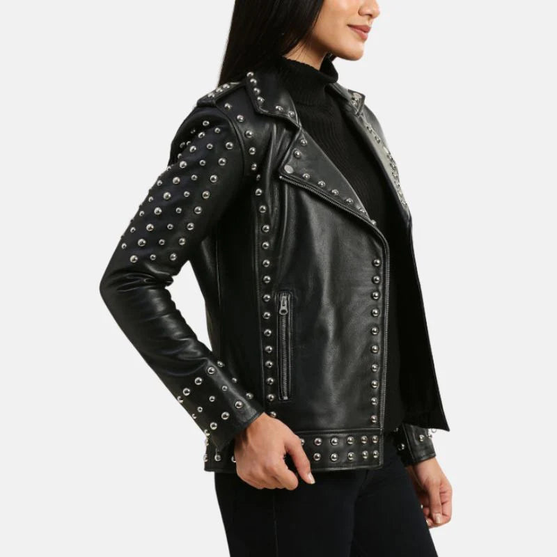 Black Studded Punk Motorcycle Leather Jacket For Womens